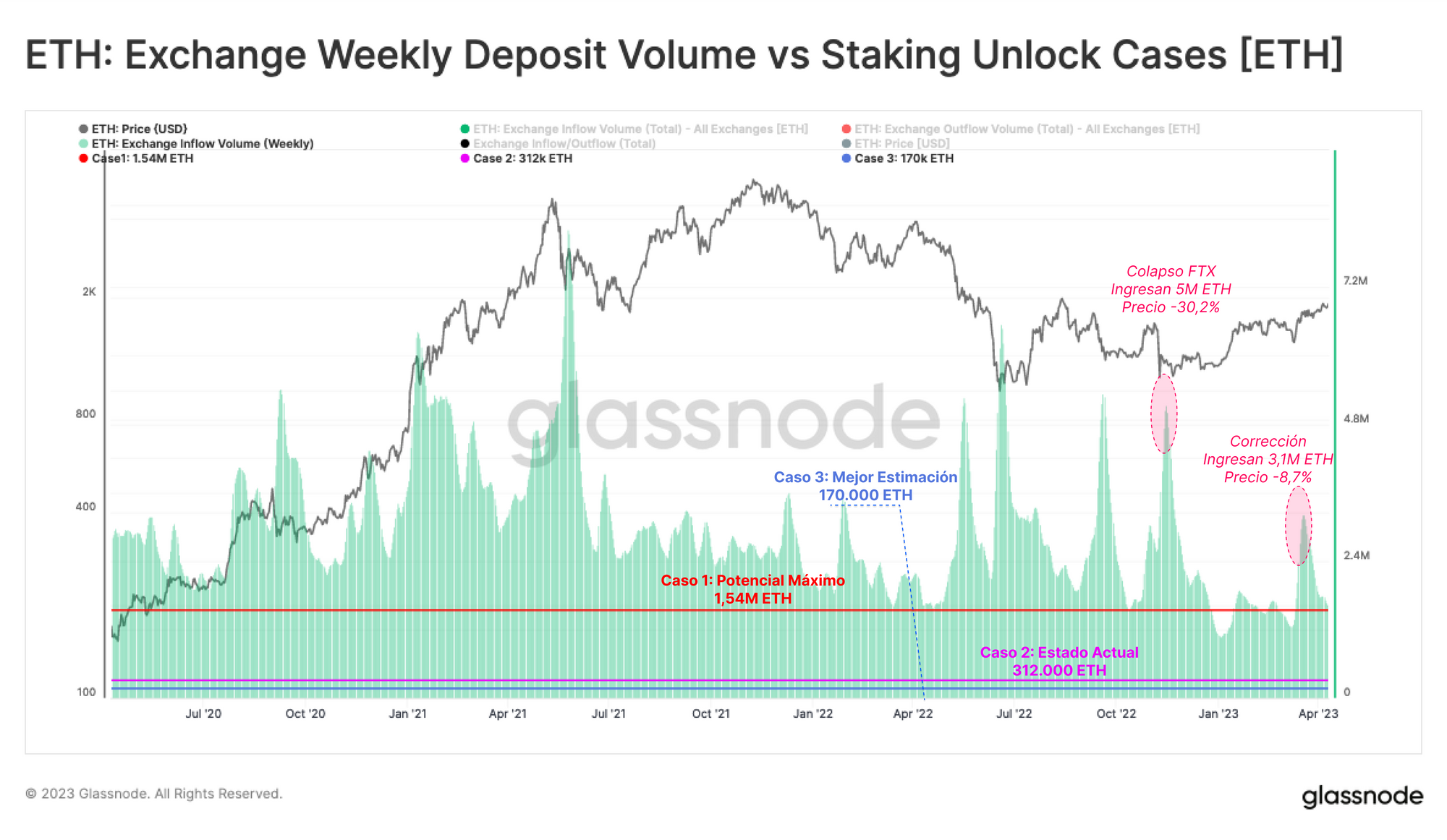 Para verlo desde la misma perspectiva, lo vamos a comparar con el típico volumen de retiros en una semana cualquiera durante eventos de ejemplo, como el colapso de FTX, para determinar la magnitud potencial del suceso. Encontramos que incluso el caso más extremo en el que se venden 1,53M de ETH sigue estando dentro del rango medio semanal de ingresos a los exchanges. En otras palabras, en el caso más extremo los ingresos medios semanales se podrían doblar, y serían de una escala similar a la de la actual corrección de mercado, en la que el precio desciende un 8,7% pero se mantiene un índice de ingresos muy por debajo de lo que vivimos durante el colapso de FTX, que provocó una caída en el precio de un 30,2%.