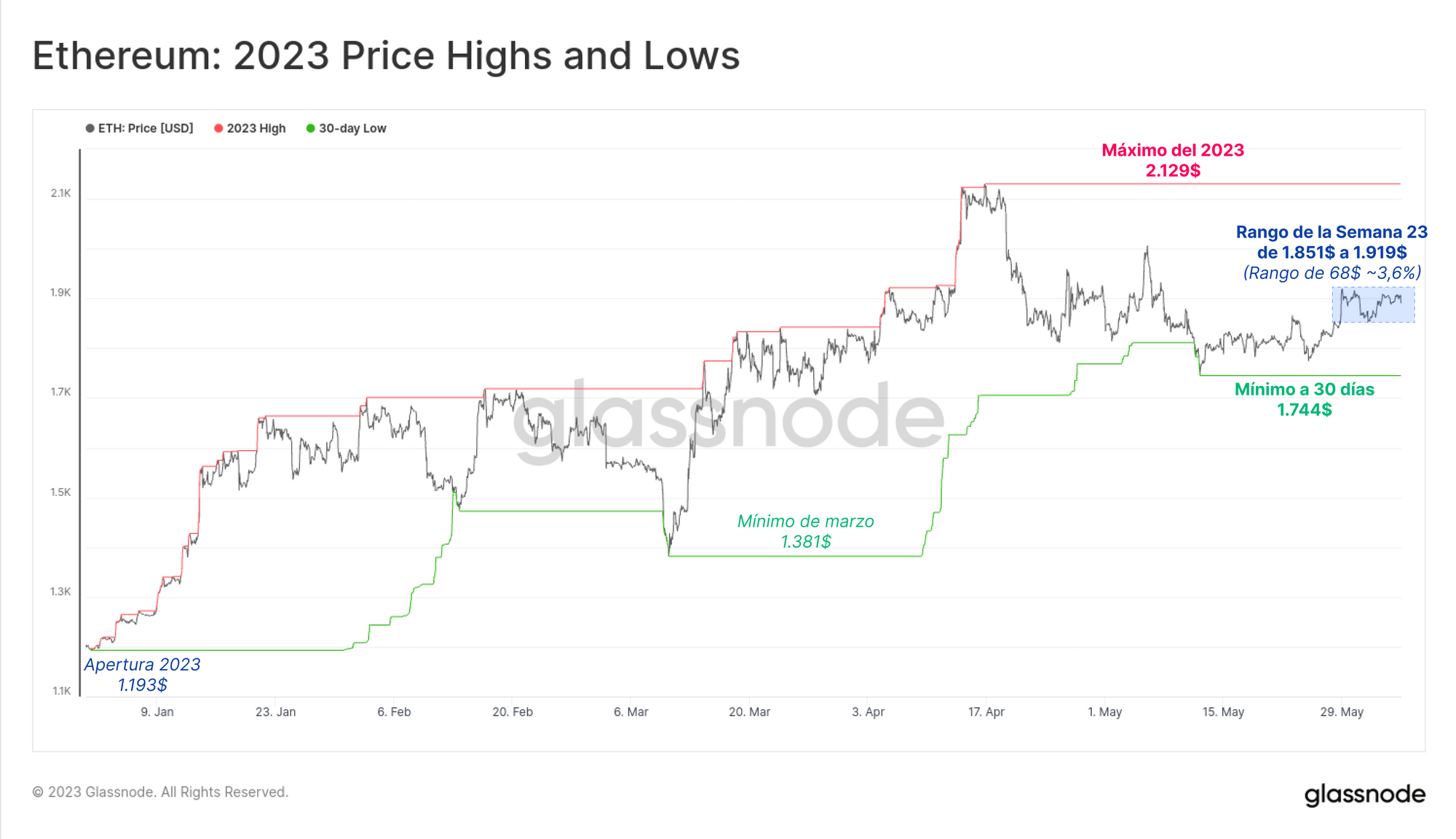 La calma y tranquilidad persisten en el mercado de los activos digitales, donde el precio de ETH se mantiene atrapado en un estrecho rango de apenas 68$ esta semana (3,6%), desde un mínimo en los 1.861$, hasta un máximo de 1.931$. Aparte de un pequeño repunte en el mercado de ETH después de la actualización Shanghai, el precio de ETH se ha mantenido prácticamente estable desde mediados de marzo.