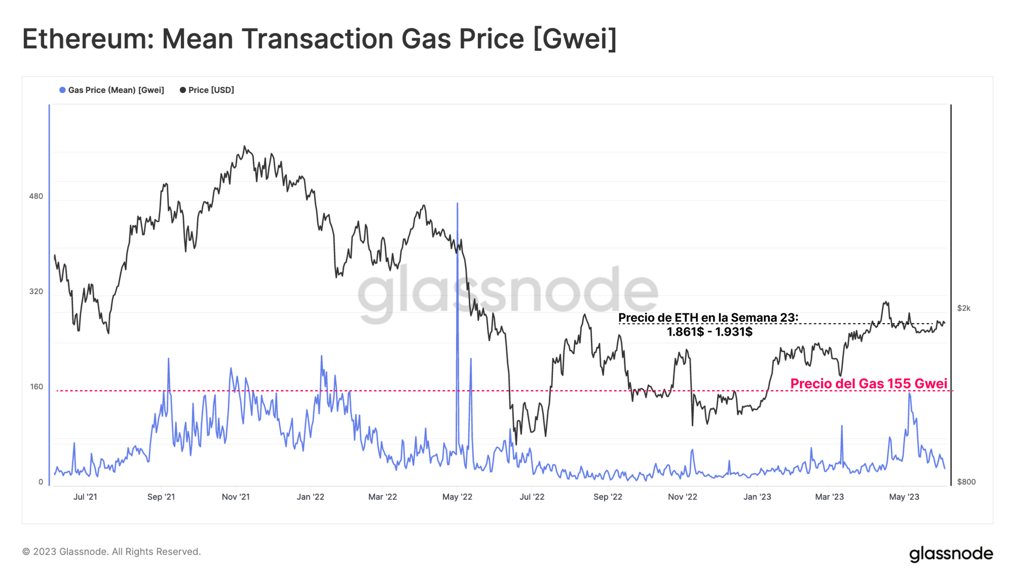 Si bien es cierto que el precio de ETH ha estado sin movimiento alguno y atrapado en un rango desde el pasado mes de marzo, por su parte el precio del gas sí que ha experimentado un repunte nada desdeñable durante el mes de mayo. El precio del gas aumentó de media hasta los 76 Gwei, lo que se traduce en unos 1,14$ por ejecutar una transacción de ETH común. La media del precio del gas llegó hasta los 155 Gwei a comienzos de mayo (unos 6,53$ por transacción de ETH), alcanzando a estar casi tan alto como en pleno ciclo alcista del 2021-22.