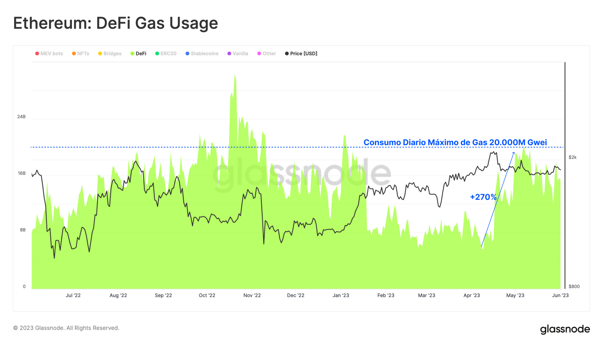 Interactuar con contratos inteligentes requiere más gas y puede costar múltiples veces lo que una transacción sencilla. La utilización del gas asociada a los protocolos DeFi creció un 270% a finales de abril, empujando el consumo de gas diario de todo el sector hasta los 20.000M de unidades de gas.