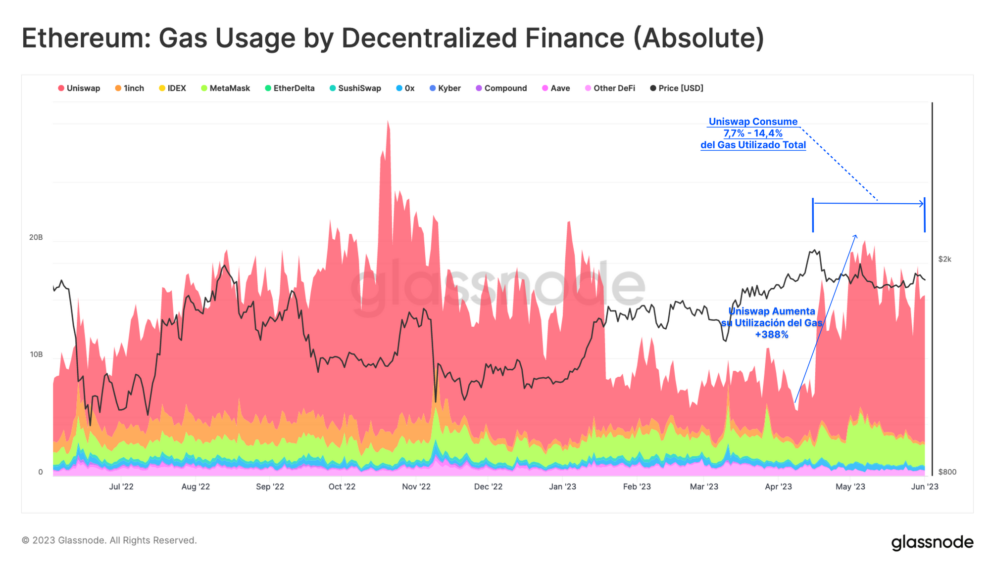 Si diferenciamos el gas DeFi por protocolo, enseguida descubrimos que el repunte de actividad está provocado por la actividad de trading que se está produciendo dentro de los exchanges descentralizados. Uniswap es el principal consumidor de gas, quien desde abril ha aumentado su utilización en un 388%, y ahora acapara entre el 7,7% y el 14,45% de la demanda total del gas de Ethereum.