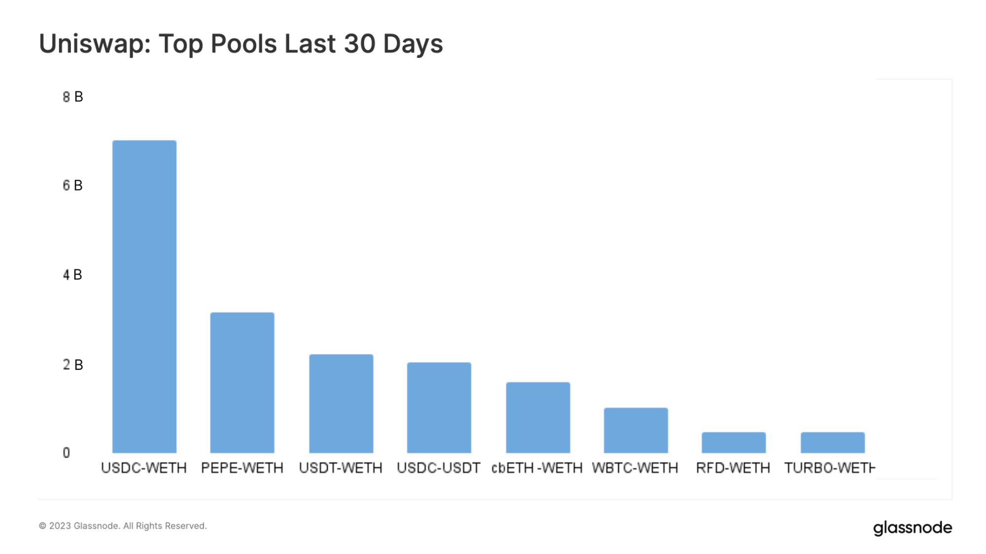 Quienes sigan las noticias probablemente asuman que el repunte de actividad se debe a la reciente histeria que rodea a las Memecoin, sobretodo últimamente con tokens como PEPE y HEX. Sin embargo, un análisis más detallado del volumen operado en Uniswap revela otra cosa.