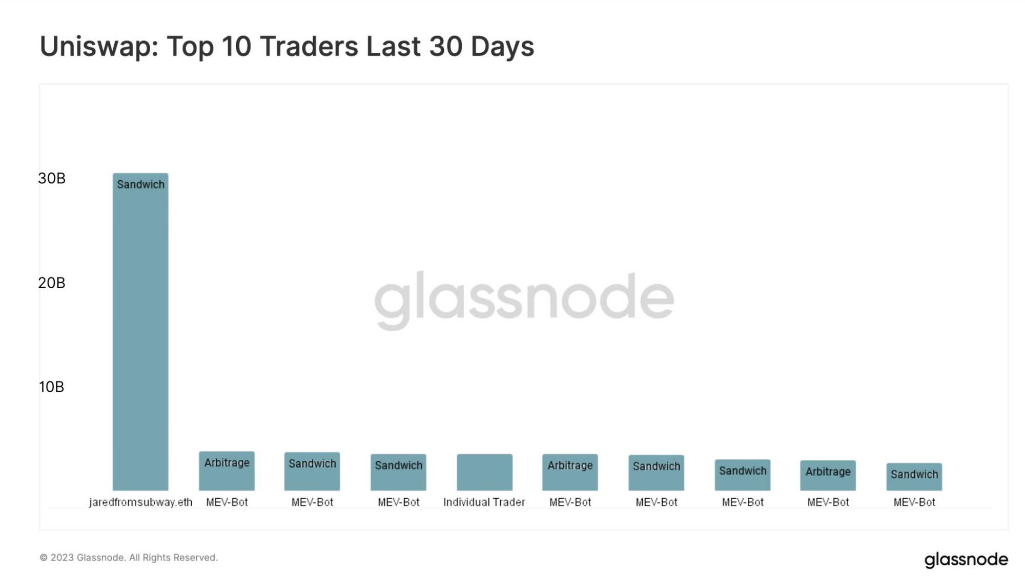 Al comparar las direcciones de los 10 mayores traders con nuestro sistema de etiquetado, encontramos que todos menos uno están asociados a bots MEV. De ellos, el archiconocido bot-MEV jaredfromsubway.eth ha ganando 3.000M $ sólo en el último mes.