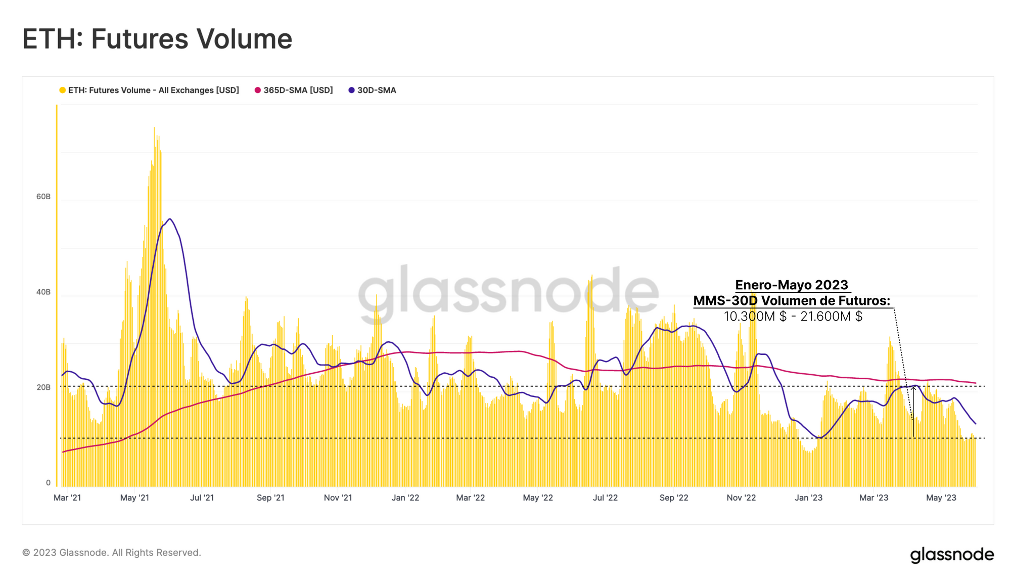 Al contrario que ocurre con el repunte en la actividad de trading que veíamos en Uniswap, el trading de futuros ha seguido encogíendose en mayo, indicando que el interés de trading institucional y su liquidez asociada permanecen bastante debilitados.