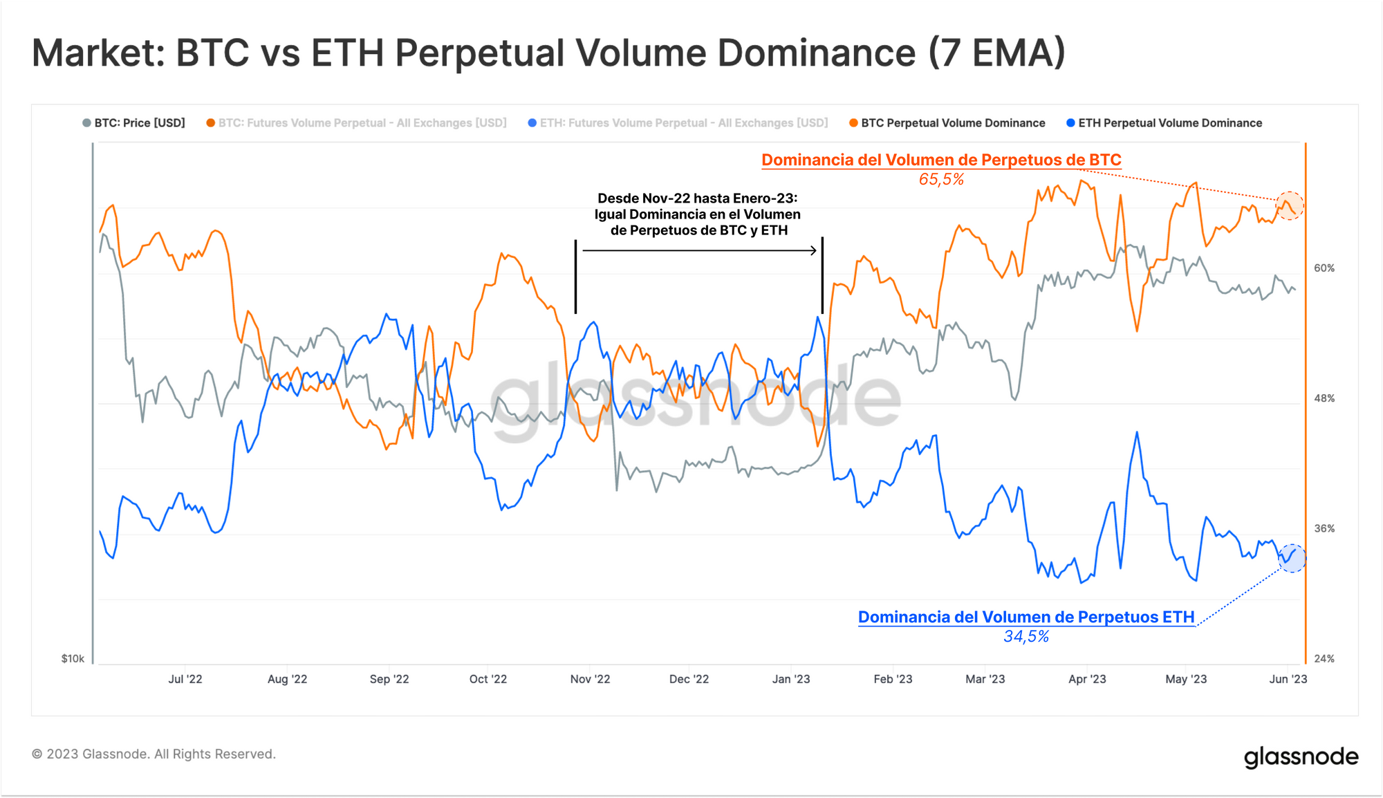 Se aprecia una clara tendencia en la dominancia relativa de volumen en los contratos perpetuos de BTC y ETH. A pesar de que el volumen combinado de ambos activos llegó a igualarse a finales del 2022, la cuota relativa de volumen de futuros de Ethereum ha caído en picado en este 2023.