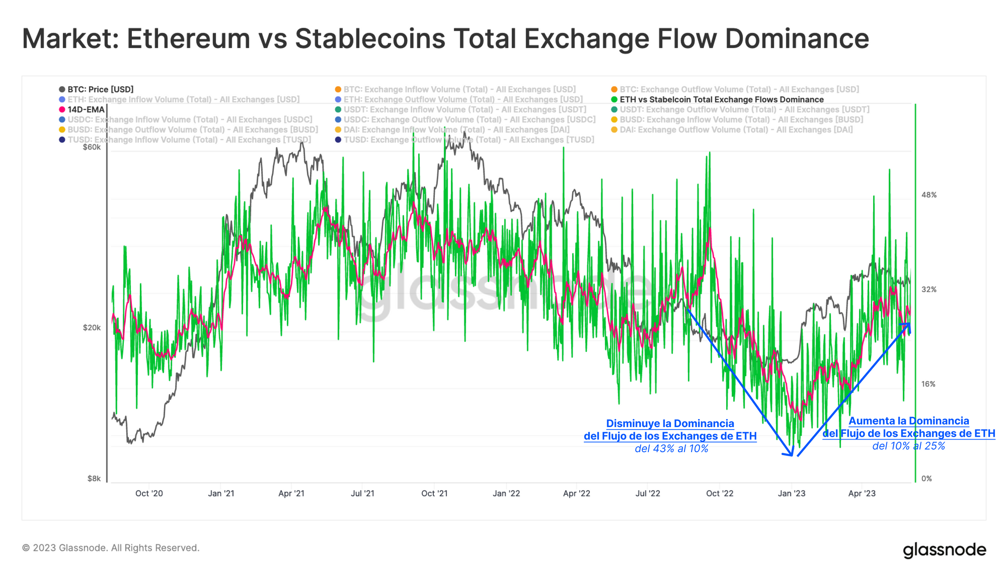 En el 2023 ha habido un fuerte cambio, y la proporción de ETH que fluye hacia los exchanges vuelve a elevarse hasta el 25%. No obstante, esta tendencia se estancó a principios de mayo, lo que evidencia un cambio de apetito para asumir menos riesgo. Los inversores que se han podido beneficiar de una gran rentabilidad durante el primer trimestre del año, puede que ahora prefieran pasar su capital de vuelta a monedas estables.
