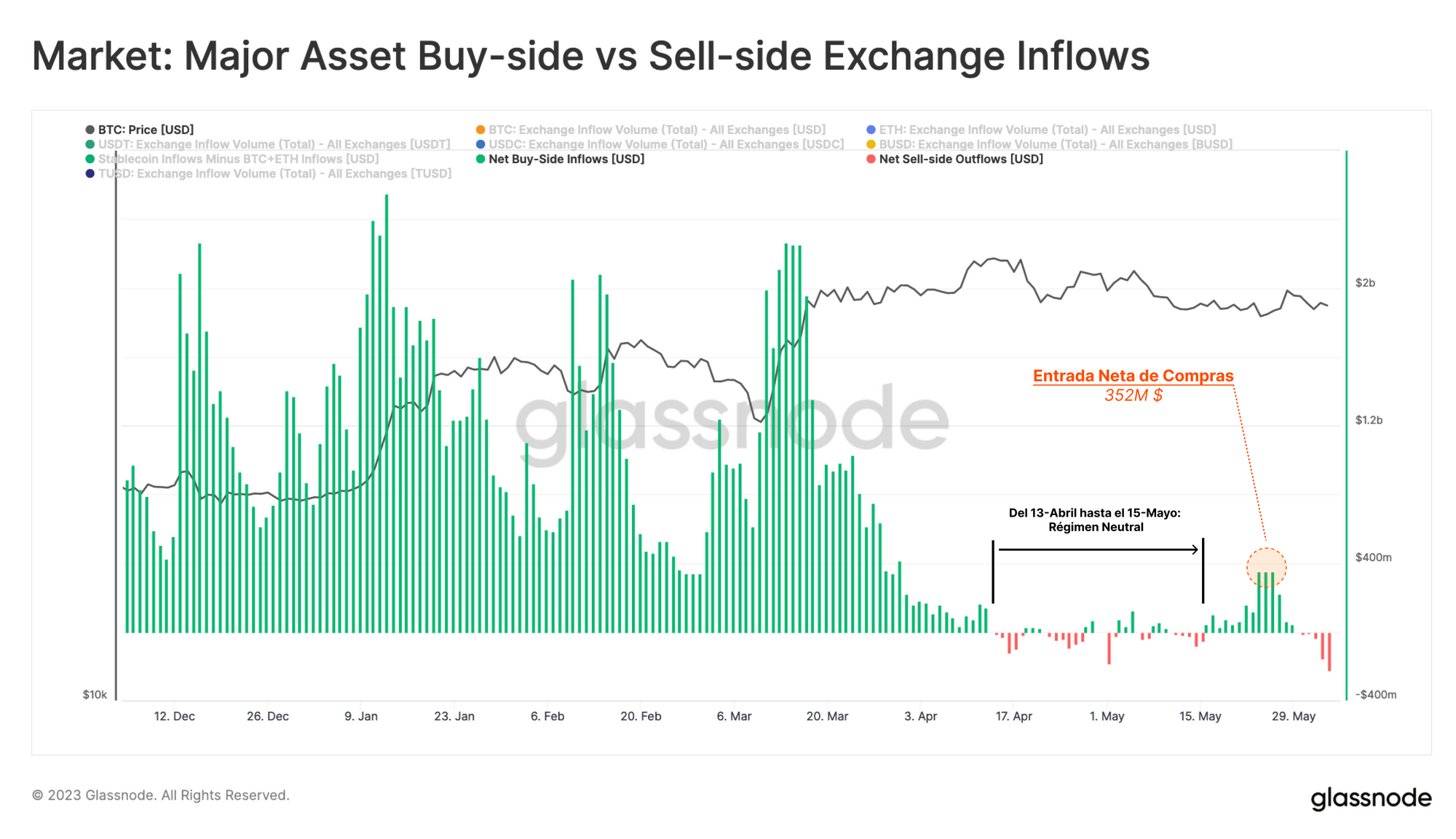 Otra forma de verificar esta conclusión, es comparando los flujos de capital de cada activo que entra a diario en los exchanges como barómetro de la presión de compra o de venta. Para este modelo simplificado, asumiremos que los ingresos de BTC+ETH a los exchanges representan presión vendedora, mientras que la llegada de monedas estables representa interés de compra.