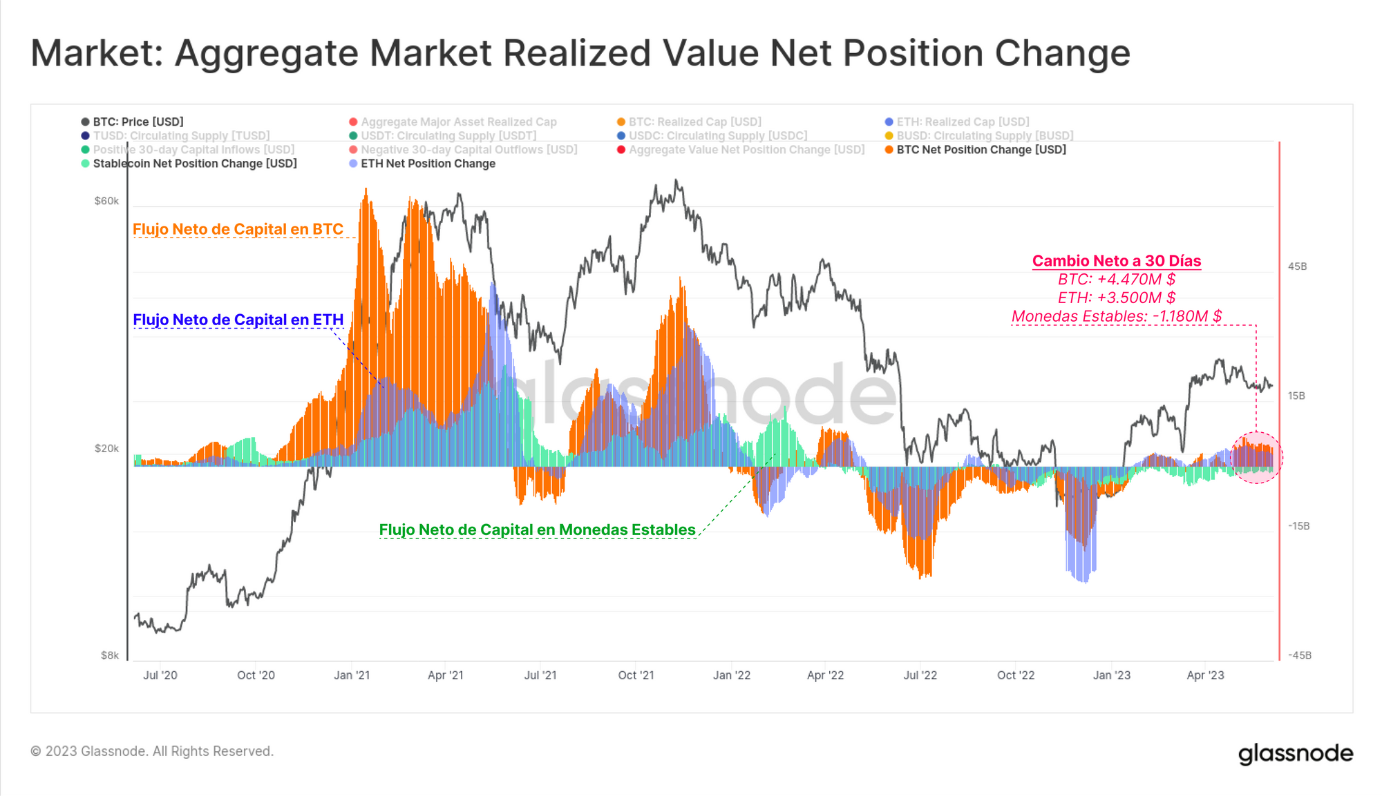 Por lo general, el capital tiende a ingresar en los activos digitales a través de los dos más importantes, BTC y ETH, o mediante monedas estables. Por consiguiente, podemos estimar la dirección que ha tomado el conjunto del capital del mercado al solapar y comparar dos métricas: