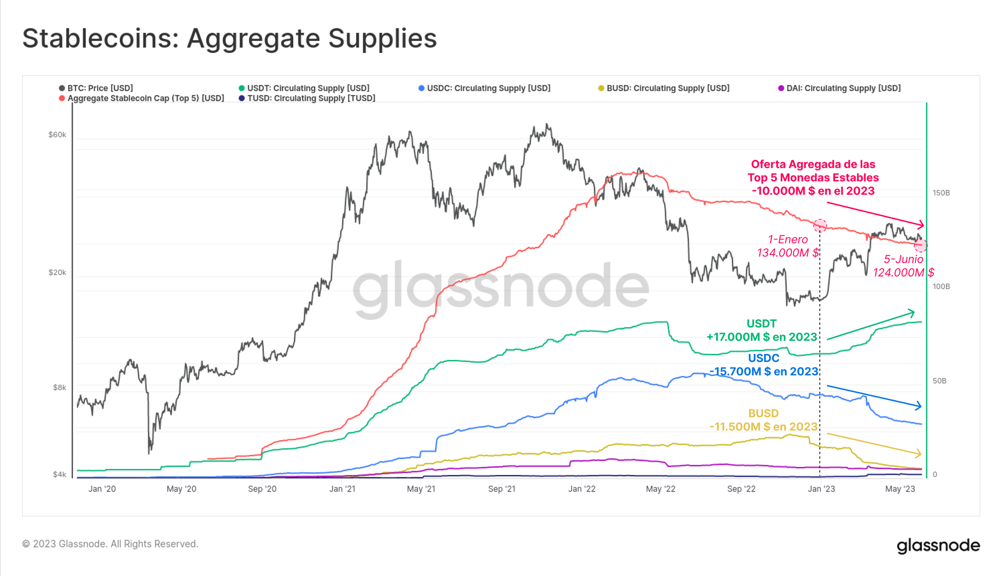 - La oferta en circulación de las monedas estables (USDT, USDC, BUSD, TUSD y DAI).
