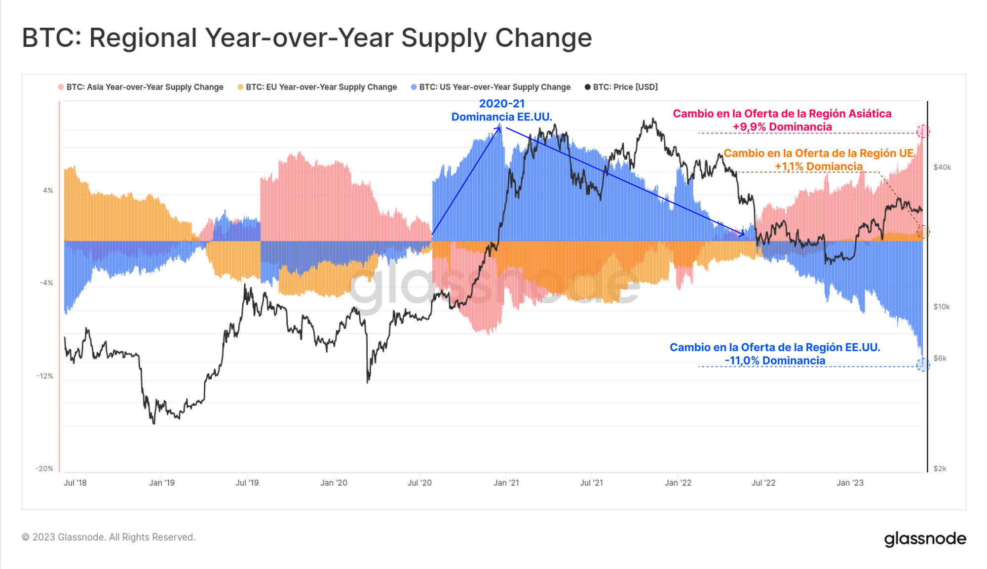 Vamos a terminar recalcando que se ha desarrollado una divergencia similar en el cambio año-a-año de la oferta de BTC de las distintas zonas geográficas. La extrema dominancia que disfrutaban las entidades estadounidenses durante el 202-21 se ha revertido por completo, ya que la dominancia de oferta de Estados Unidos ha caído un 11% desde mediados del 2022. Por su parte los mercados europeos han conservado la estabilidad a lo largo del último año, mientras que ha sido Asia la que ha aumentado mucho su dominancia sobre la oferta durante sus horas de apertura.
