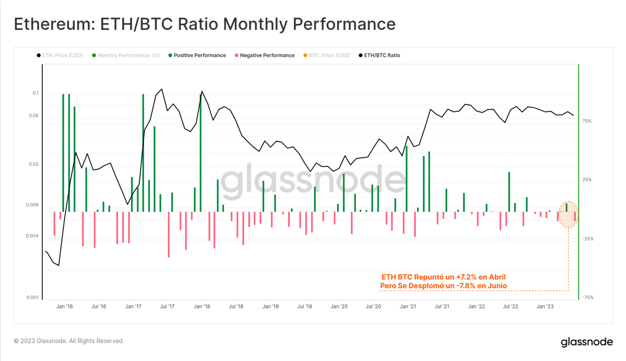 En términos relativos, muchos activos digitales han perdido terreno ante Bitcoin en este 2023, y el ratio ETH/BTC resbala hasta el mínimo de las últimas 50 semanas en los 0,060. Sin embargo el ratio ya ha vuelto a crecer hasta los 0,063, dando muestras de que julio empieza con buena cara para ETH.