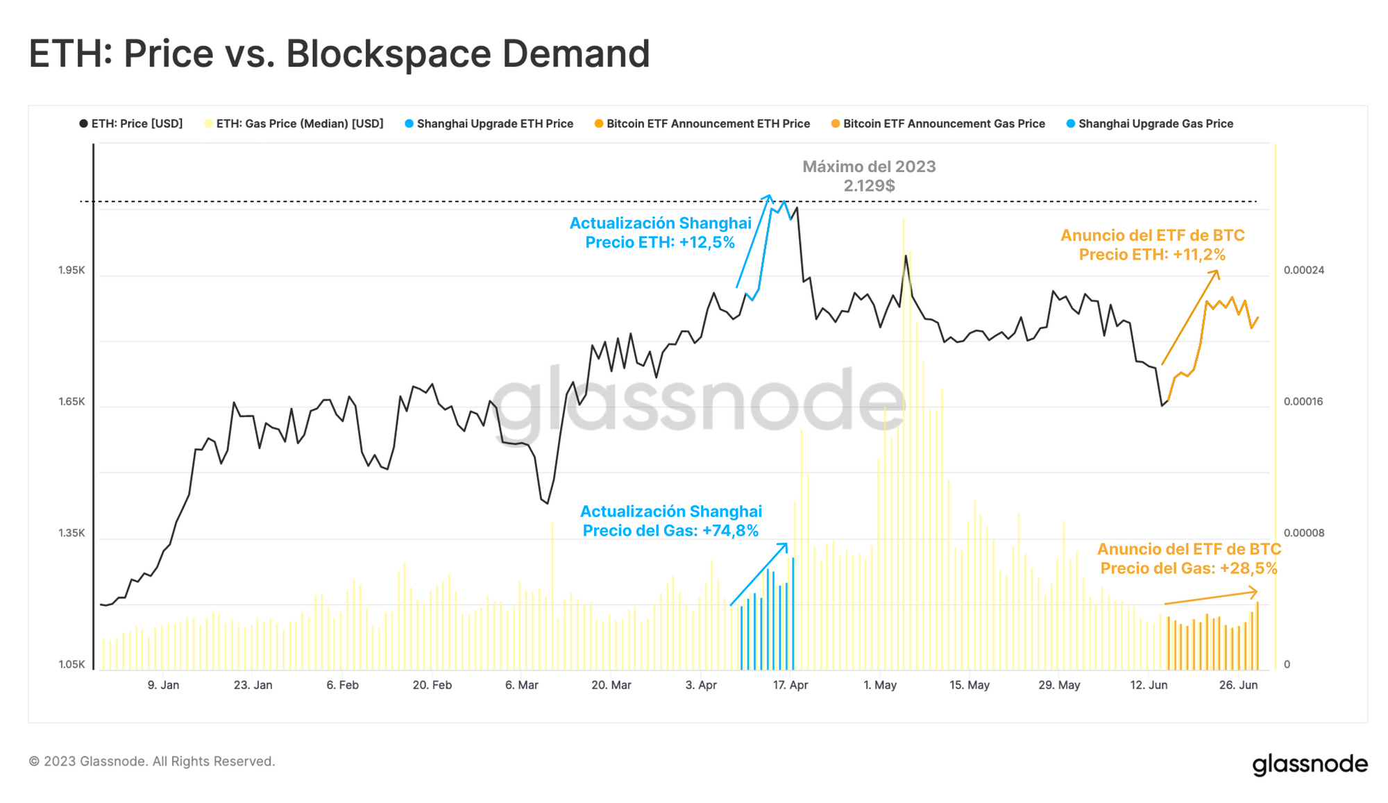 En lo que llevamos de 2023, el repunte del precio de ETH no ha supuesto ningún aumento significativo dentro de la actividad del network. El precio del gas, que es considerado un buen barómetro de demanda del espacio por bloque, ha permanecido relativamente bajo, especialmente en la semana siguiente al anuncio de la solicitud del ETF. Por comparar, tras la actualización Shanghai que tuvo lugar en abril, que propició un repunte similar en el mercado de ETH, el precio del gas ascendió un 78% frente al 28% de esta semana.