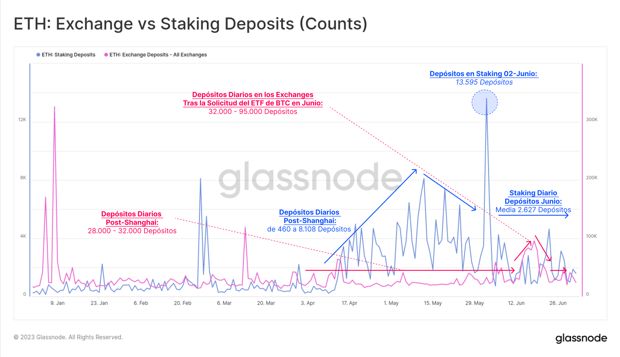 La actividad de los depósitos (recuento de transacciones) imprimió un pico el 2 de junio, registrando más de 13.595 nuevos depósitos (valorados en más de 408.000 ETH). Algo que no se compara con la cantidad de transacciones con depósitos de ETH a los exchanges, que durante este mismo periodo de tiempo ha permanecido inmutable en torno a los 30.000 depósitos.