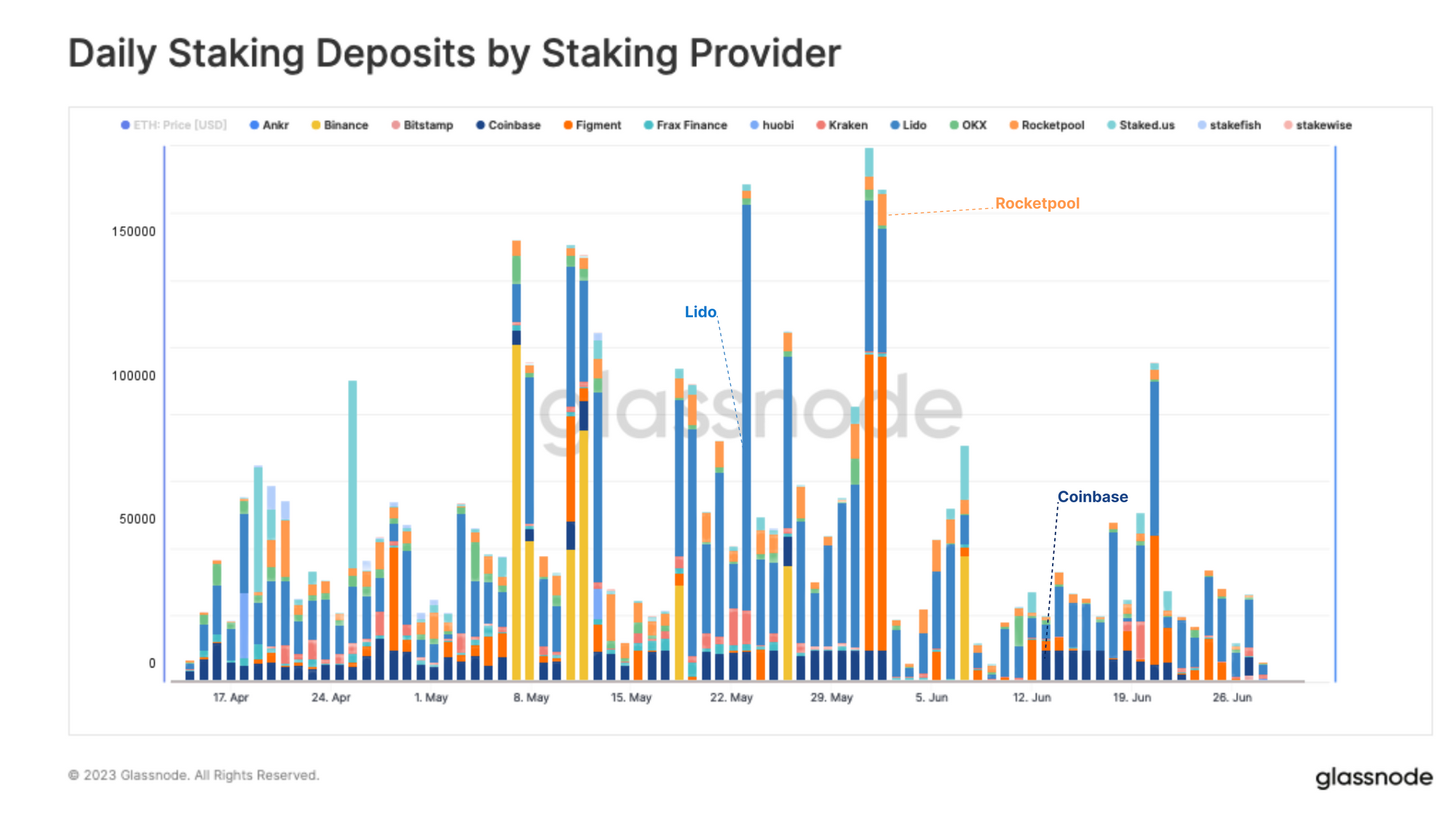 Examinándolo un poco más de cerca, si diferenciamos qué depósitos han ido a parar a cada proveedor, encontramos una clarísima tendencia a favor de los proveedores de staking líquido, donde Lido encabeza la lista.