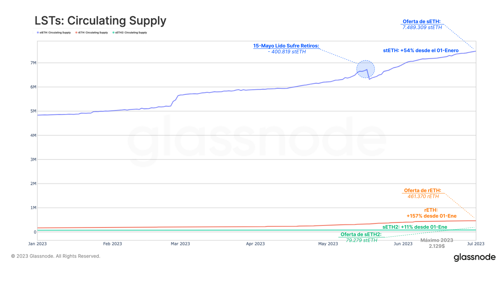 Sin embargo, la enorme avalancha de nuevos depósitos de ETH ha más que compensado el descenso, haciendo que stETH alcance un nuevo máximo histórico de 7,49M. Está claro que Lido es el claro líder del sector, ya que su oferta es 16 veces superior a la de su competidor más cercano. Dicho esto, la oferta de rETH, que es el token de staking líquido que ofrece Rocketpool, ha crecido tres veces más rápido que el de Lido desde comienzos de año.