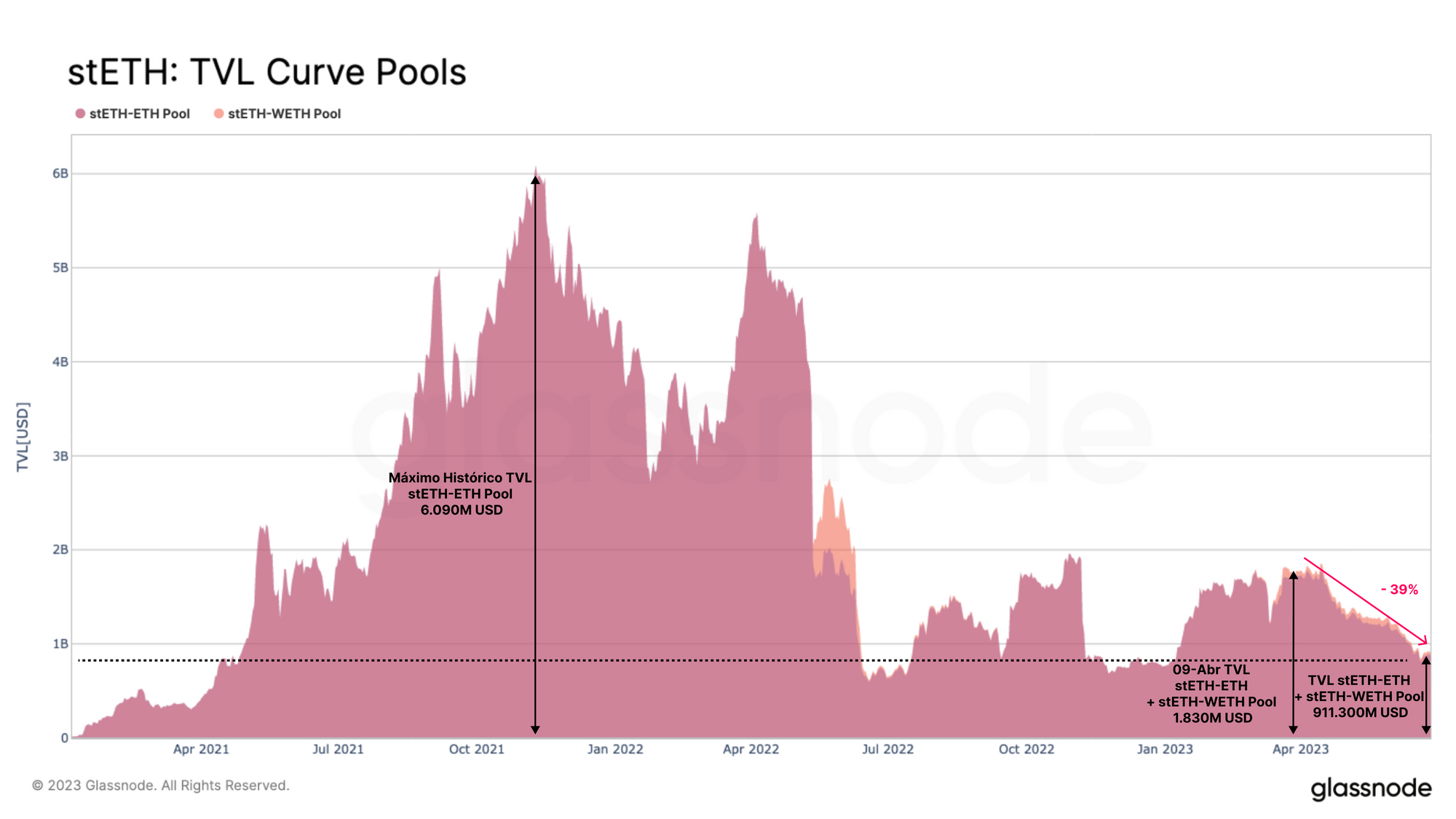 Desde la Actualización Shanghai, el stETH-ETH de Curve Pool, que es la mayor reserva de liquidez de derivados staking de Lido, ha perdido un 39% de valor. De hecho, va de camino a revisitar los niveles que alcanzamos tras el gran desapalancamiento que tuvo lugar tras el colapso de Terra-Luna en mayo del pasado 2022.