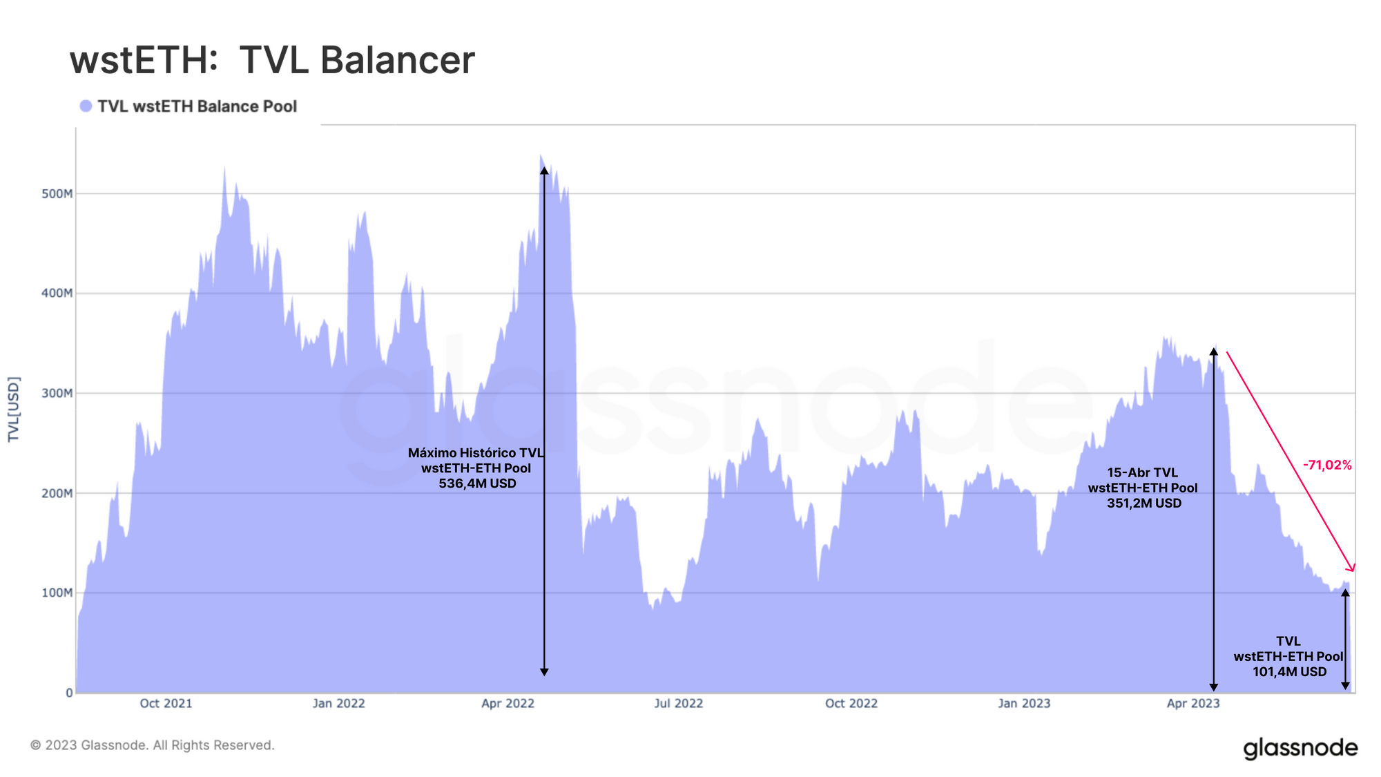 Al observar desde Balancer el Pool wstETH-ETH, vemos que la tendencia es aún más pronunciada. Desde el 15 de abril, el TVL de esta reserva ha crecido un 71%, reduciendo su valor de 351,2M $ a 101,4M $.