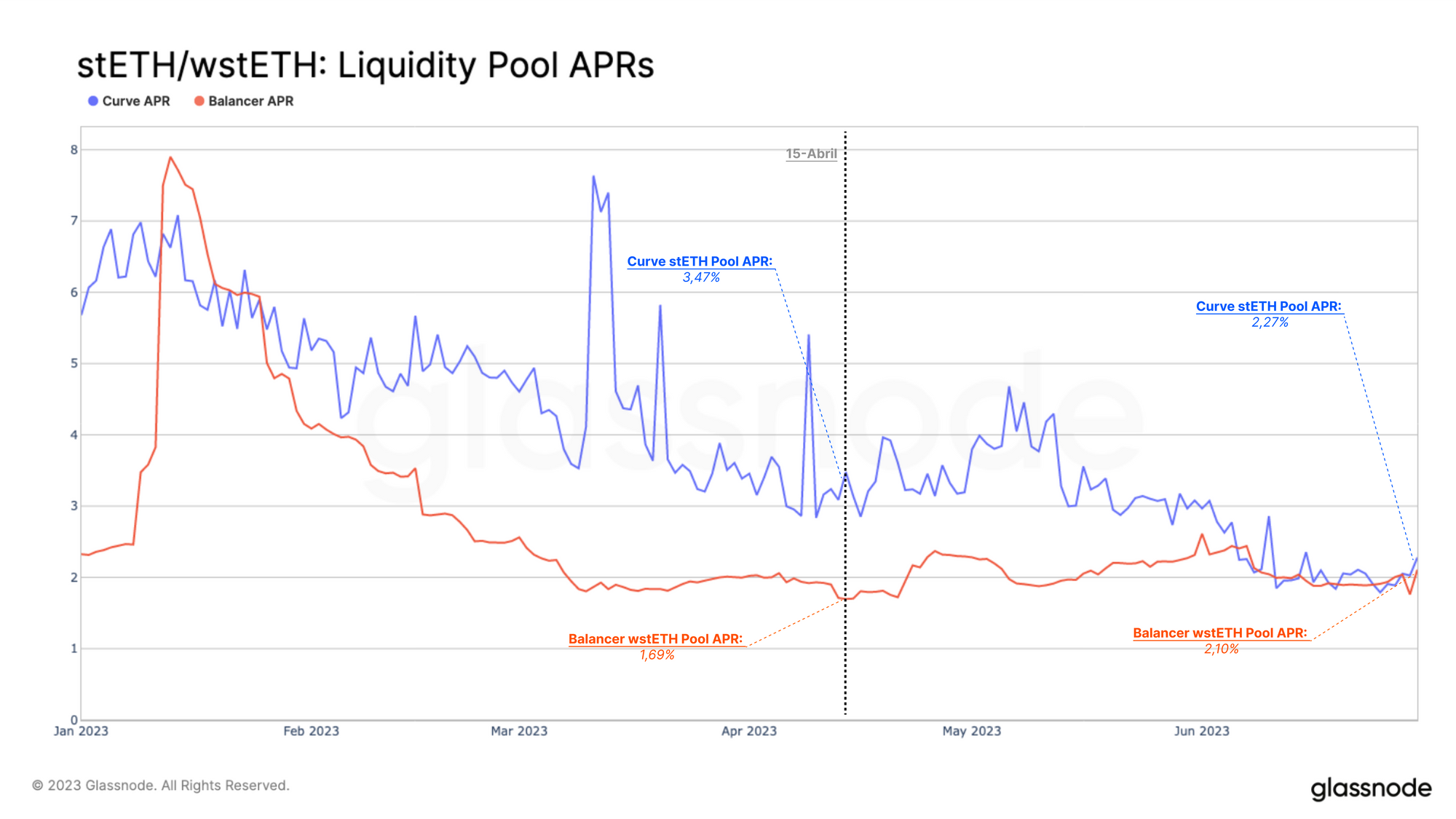La rentabilidad de la reserva Curve de stETH-ETH ha caído del 3,47% en abril al 2,27% de hoy en día. Por otra parte, la reserva Balancer ha crecido hasta el 2,10% desde el punto más bajo que alcanzó en abril de 1,69%.
