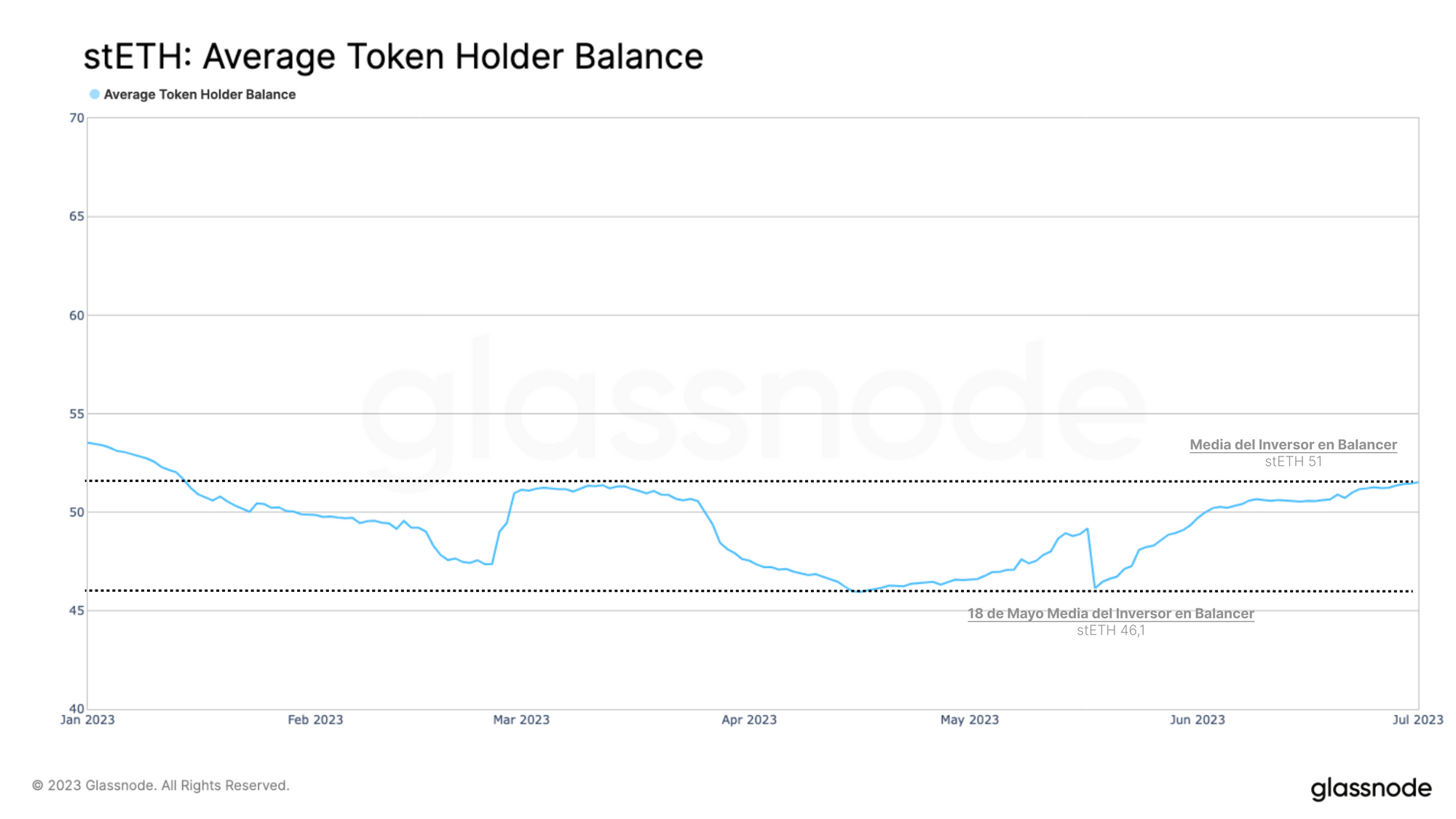 Desde la actualización Shanghai, el balance medio de stETH ha crecido hasta los 51,0 stETH (100.000$), prueba de que efectivamente los inversores actuales están engrosando sus posiciones de ETH en staking a través de stETH. También sugiere que aún quedan por llegar al mercado muchos inversores que quieran utilizar estos mecanismos de staking.