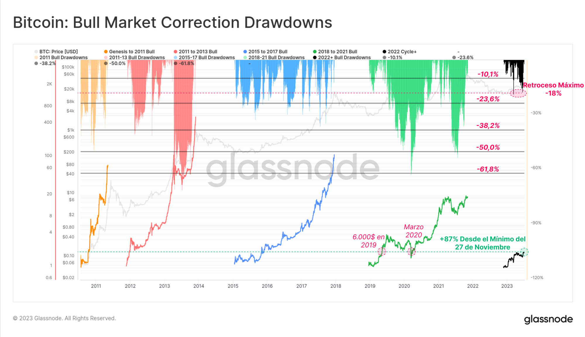 - El precio de Bitcoin está consolidando en torno al punto medio del ciclo 2021-22 en los 30.000$, registrando en lo que va de año unas fuertes ganancias históricamente hablando.