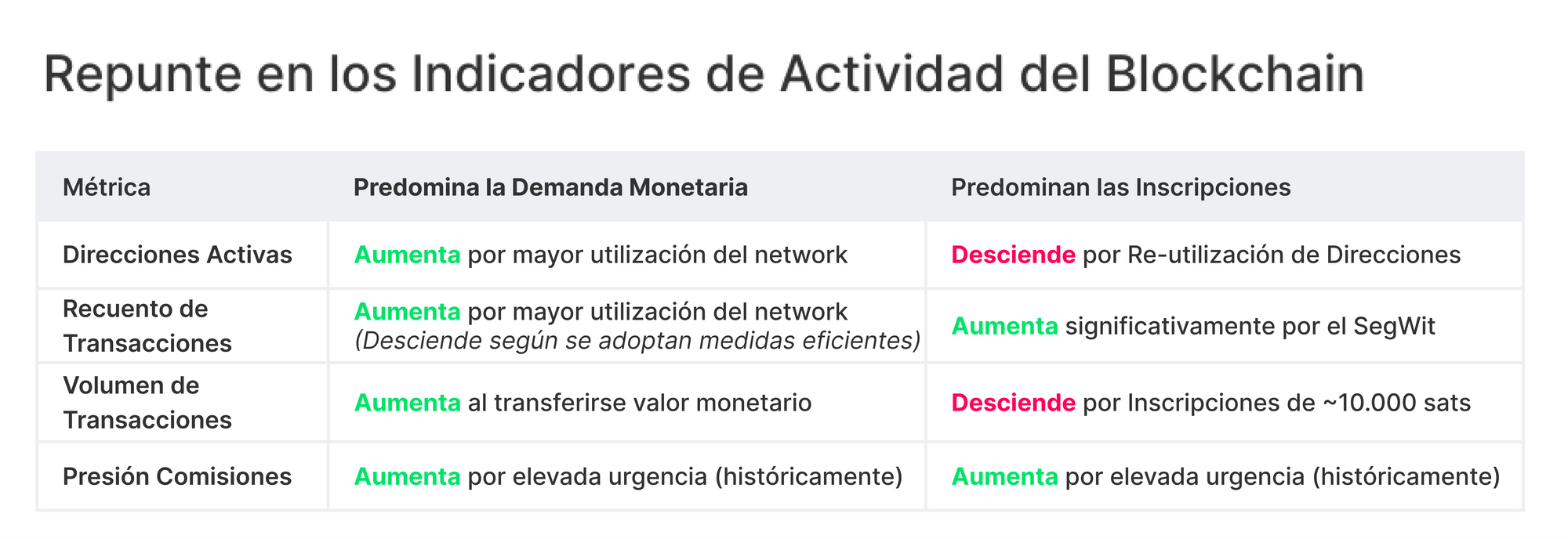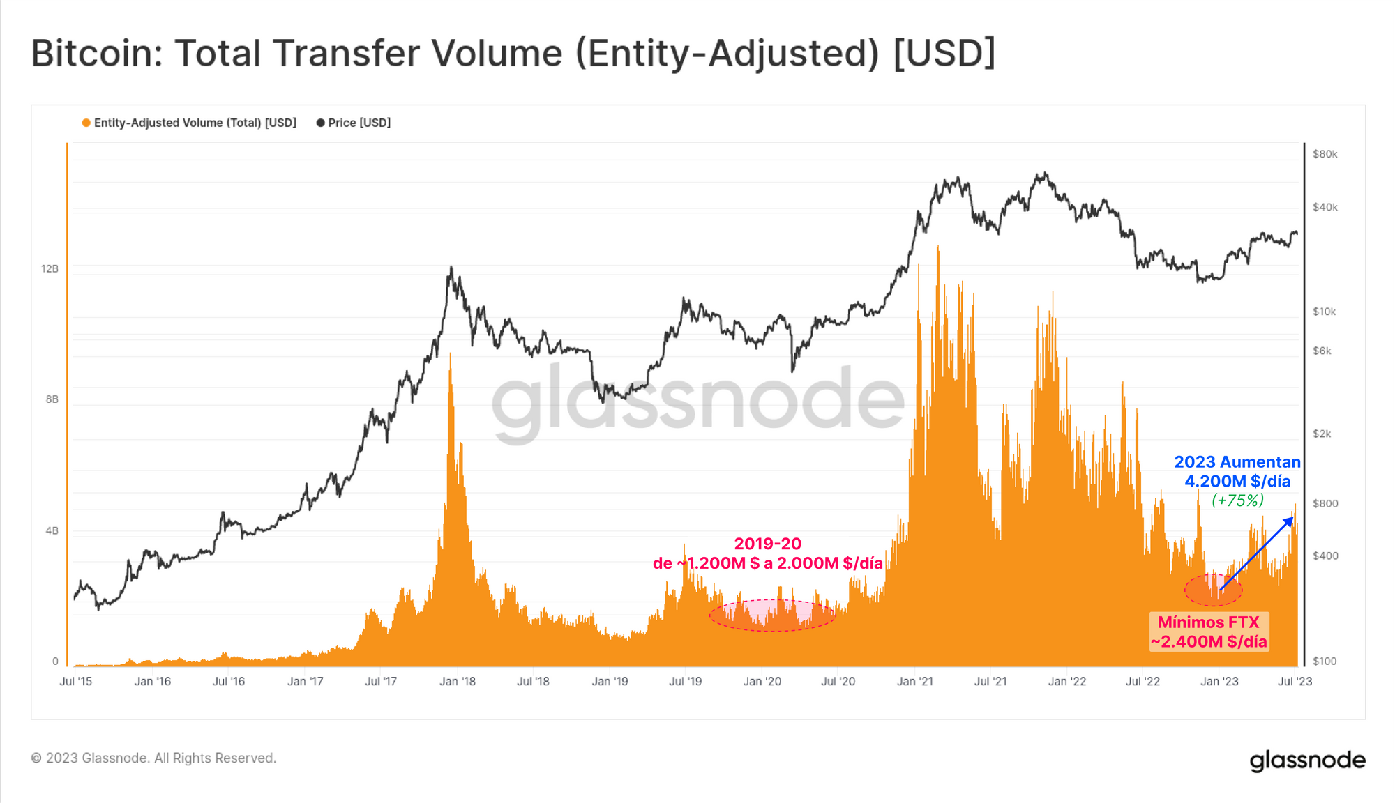 - Las inscripciones han se han relajado bastante y la congestión del network de Bitcoin se empieza a disipar. No obstante, el volumen de transferencias monetarias aumenta, y está ahora a un +75% desde los mínimos impresos en noviembre.