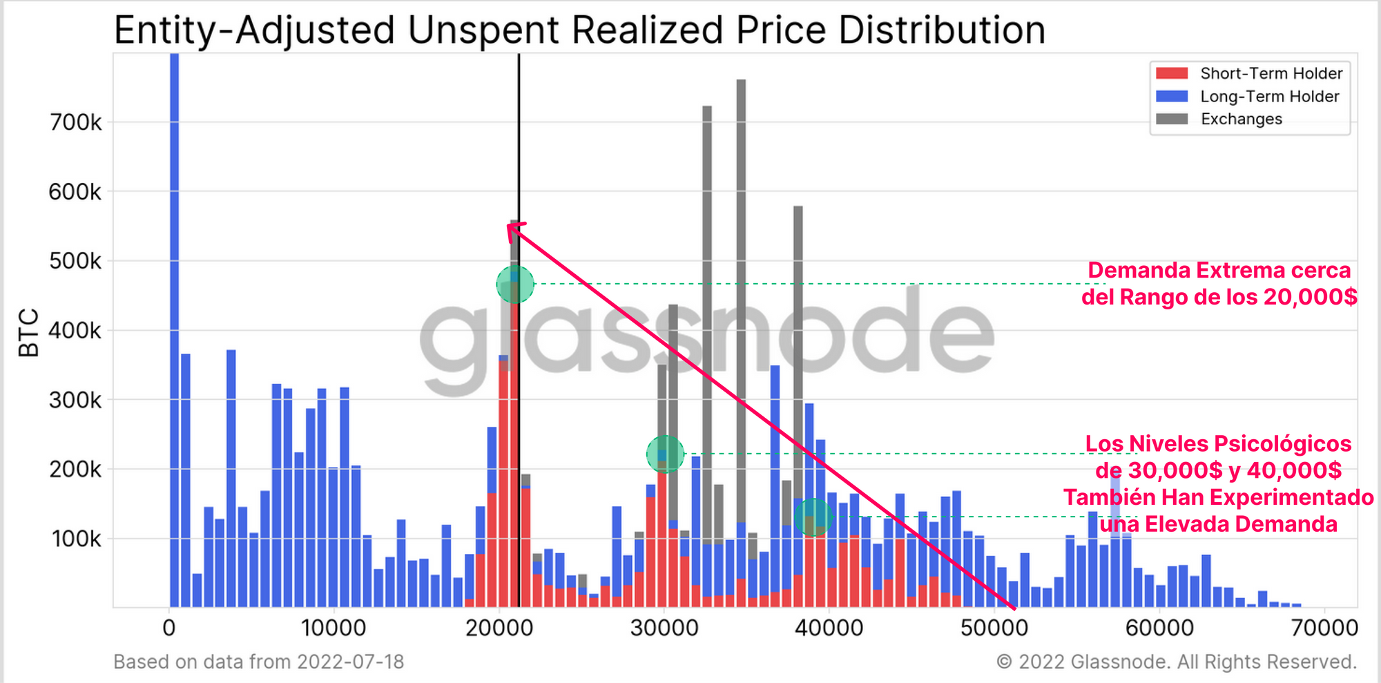 - Se aprecia que los nodos de demanda de los Inversores a Corto Plazo se ubican en niveles de precios psicológicos como los 40.000$, 30.000$ y 20.000$. Mucha de esta oferta en concreto (incluyendo la oferta de los ILP) no ha terminado capitulando, y eso a pesar de que los precios han caído más de un 50% desde su punto de adquisición. Con casi toda certeza los dueños de esas monedas son compradores relativamente insensibles a los vaivenes del precio.