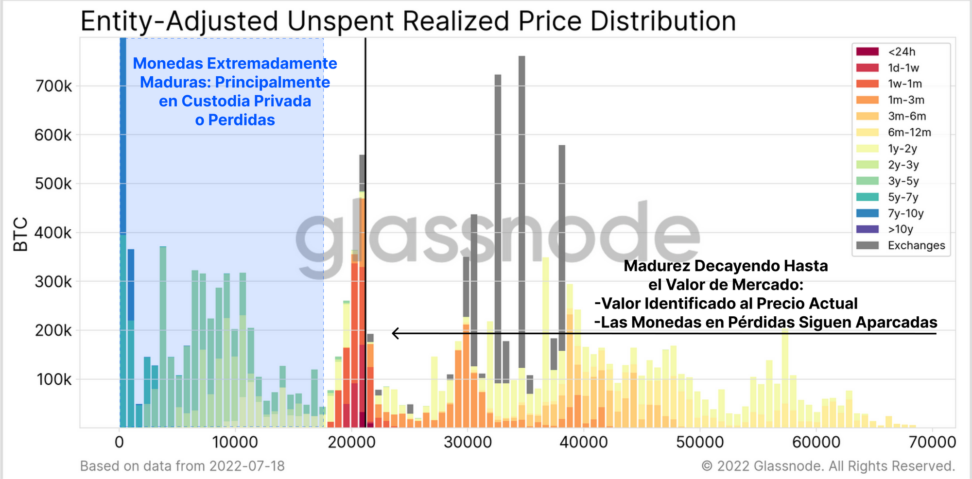 - La madurez va decayendo desde el Máximo Histórico hasta el valor de mercado actual, reflejo de la duración de la tendencia bajista aún vigente Los grandes volúmenes que han sido acumulados hace más de 6 meses, y los cuales sostienen pérdidas no realizadas muy sustanciales, parecen no estar dispuestos a venderse.