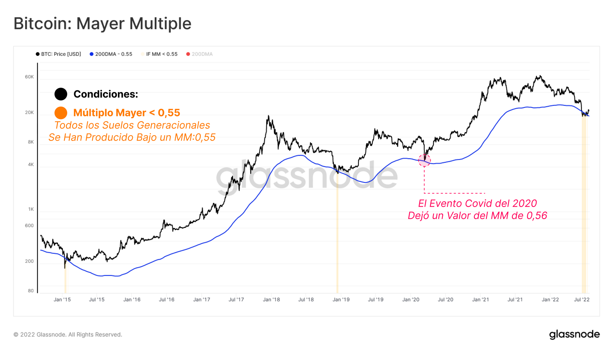 Se puede utilizar el Múltiplo Mayer para medir las desviaciones entre el precio spot y la Media Móvil Diaria de 200 periodos. La MMD de 200 periodos se usa ampliamente en el ámbito del análisis técnico como herramienta para distinguir entre macro tendencias alcistas y bajistas.