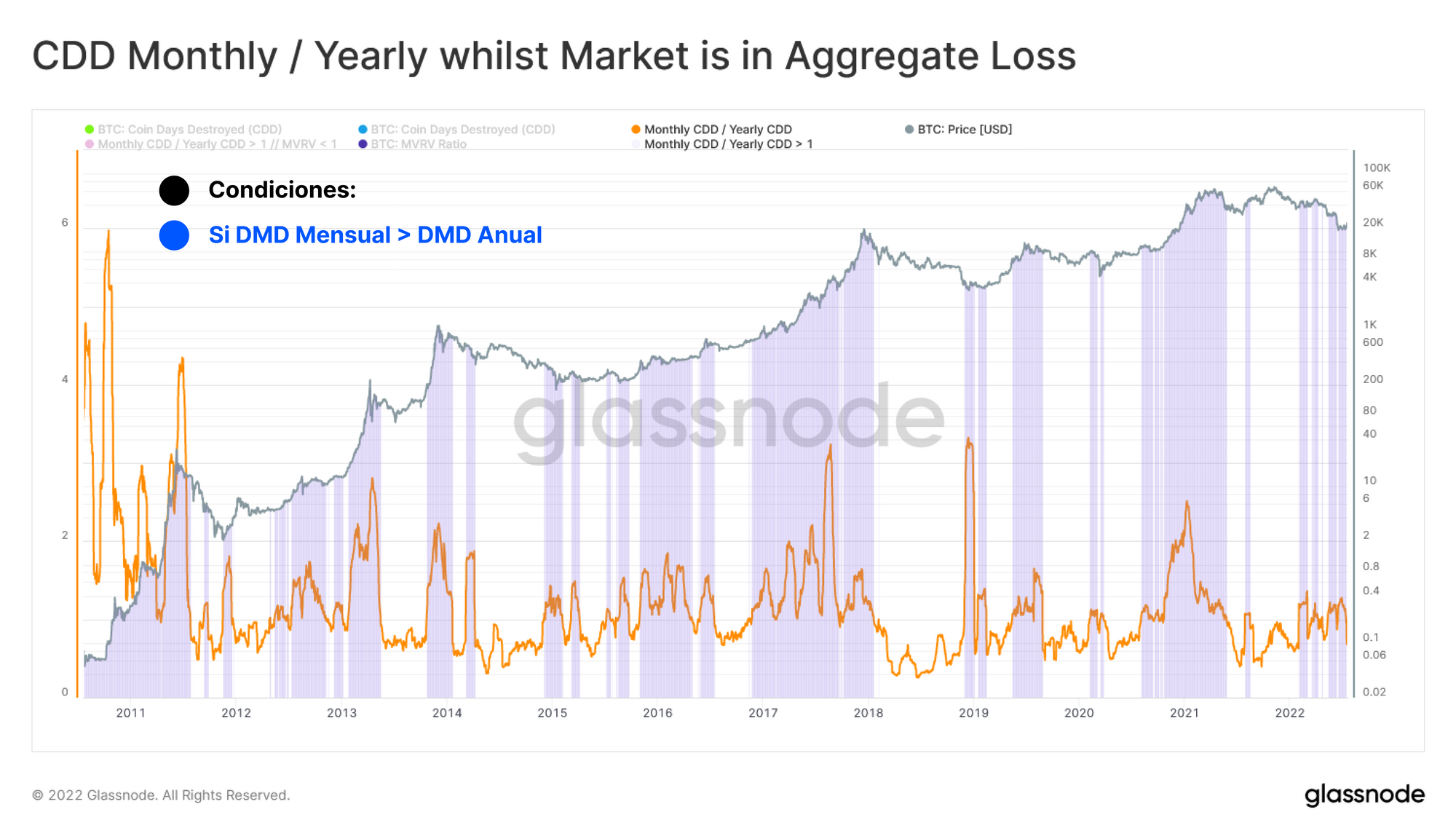 Ahora podemos incluir el concepto de los Días Monetarios Destruidos (DMD), que usamos para identificar periodos en los que el comportamiento de gasto pueda estar predominado por monedas relativamente viejas, o jóvenes. Cada día que pasa sin que una moneda se gaste, esa moneda acumula un día monetario, equivalente a su volumen en BTC. Cuando esa moneda se gasta, consideramos que se destruye todo el tiempo que ha acumulado, y esto engendra al modelo de los DMD. Esta herramienta capta de manera muy efectiva el valor ponderado por tiempo de las monedas que se mueven a diario.