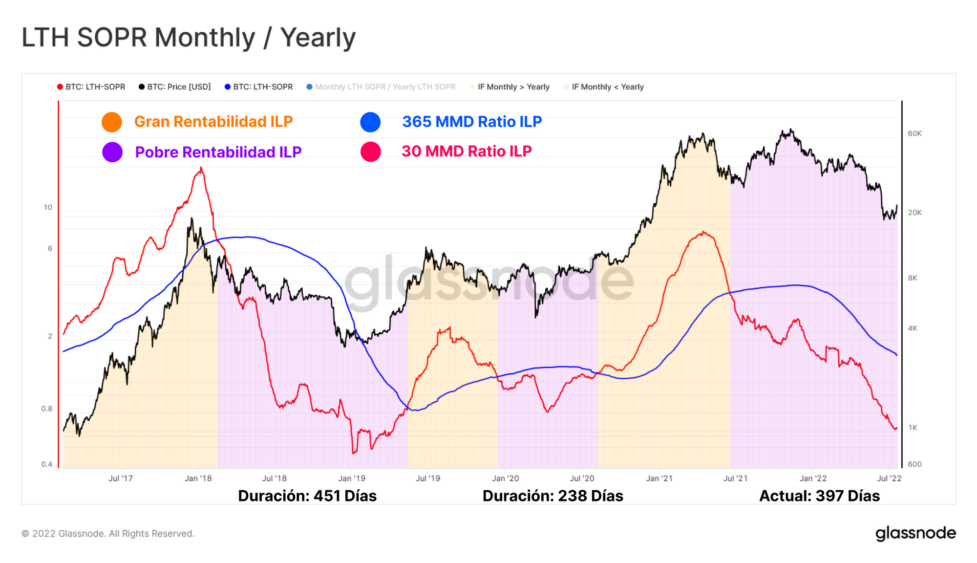 Una interesante interacción que podemos observar ocurre cuando el coste base de los ILP vuelve a rebasar al alza el coste base del mercado total (el Precio Realizado). Para que el Precio Realizado de los ILP pueda aumentar, tienen o bien que adquirir monedas por encima de su coste base, o que maduren las monedas ya adquiridas a ese coste base superior más allá del umbral de los 155 días. En un mercado bajista, se manifiesta comúnmente con una barra alta, y muy rara vez pasa.