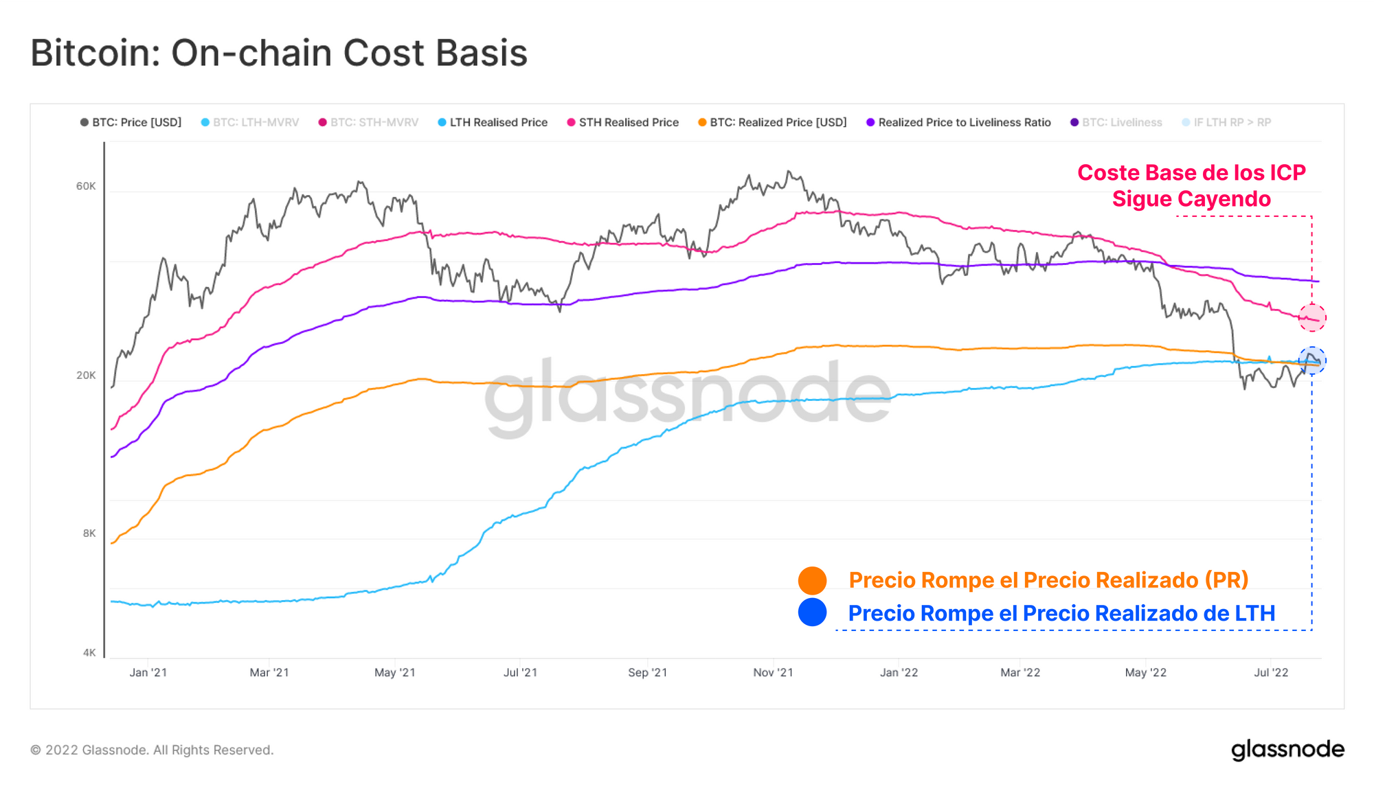 - El Coste Base de los Inversores a Corto Plazo se encuentra en los 28.500$ y mantiene una fuerte pendiente bajista. Es la consecuencia de dos dinámicas, las pérdidas realizadas por los ICP, que arrastran consigo al coste base medio, y el traspaso de riqueza monetaria a un nuevo grupo de ICP que están dispuestos a comprar más cerca (o más abajo) del precio spot actual.