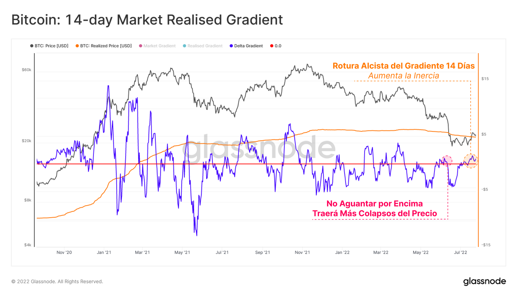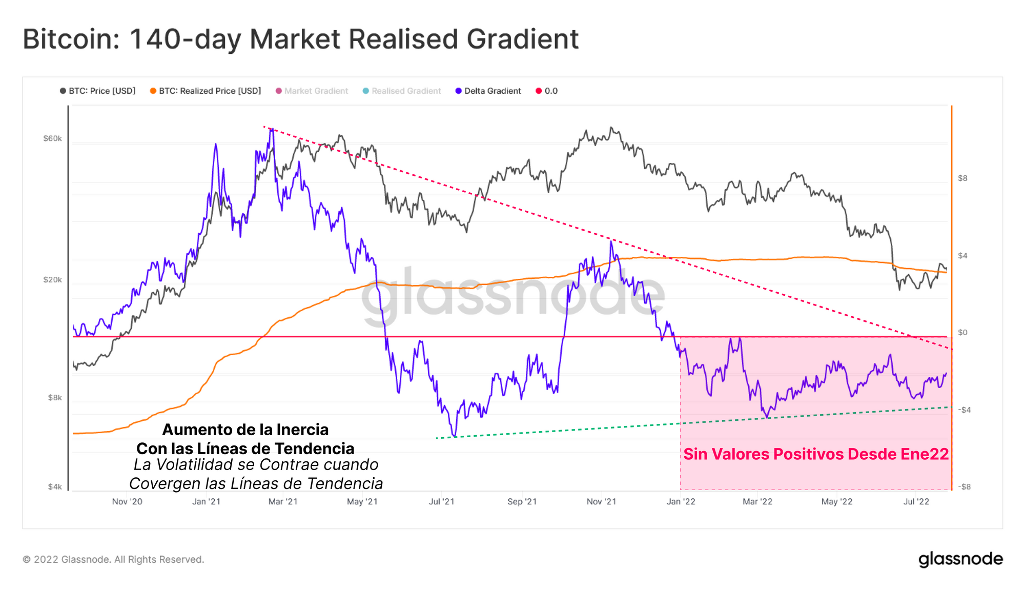 - El Gradiente de 140 días lleva imprimiendo picos cada vez más bajos desde marzo del 2021, y aún no ha registrado un valor positivo en lo que llevamos del 2022. Esto resalta una macro dinámica de carácter bajista que seguramente lleve vigente desde hace 15 meses.