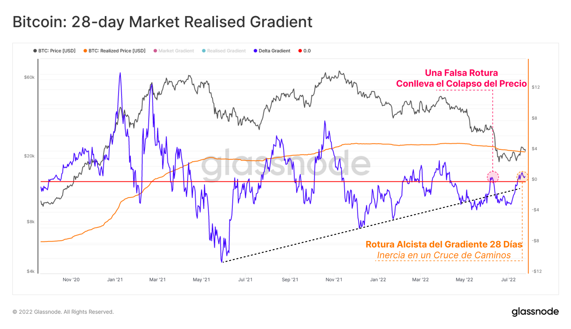 A través de la lente del Gradiente de los 140 días, el desplome que aconteció en mayo del 2021 sigue siendo el giro de inercia más severo de este ciclo. A pesar de ello, como ya discutíamos en Un Mercado Bajista de Proporciones Históricas, los recientes desplomes de mayo (LUNA) y junio del 2022 pueden considerarse unos de los más grandes jamás vistos. Desde una macro perspectiva, esto indica que el grado de inercia bajista disminuye con el tiempo, significando que hemos alcanzado un cierto grado de agotamiento vendedor, y que por consiguiente finalmente se avista algo de estabilidad.