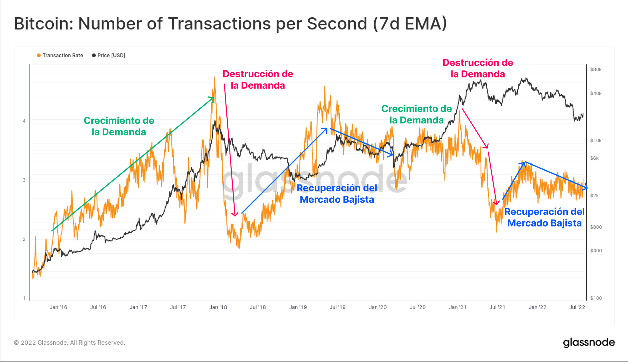 Tras la purga inicial que trajo la consecuente destrucción de demanda de mayo del 2021 🔴, la demanda transaccional ha estado lateralizando con un ligero tinte bajista, demostrando que tan solo siguen activos aquellos inversores y traders de máxima convicción en el activo, quienes siguen conformando una base estable en el network.