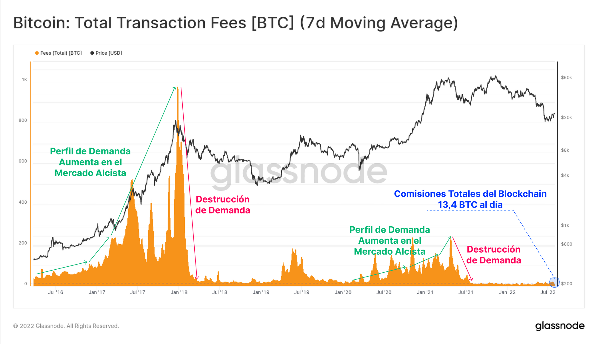 Como resultado de una pobre demanda de transacciones, las comisiones de las transacciones del blockchain siguen claramente en territorio de mercado bajista 🔵, con apenas unos 13,4 BTC pagándose en total al día en comisiones. Muy parecido a lo que ocurre con las direcciones activas, y la demanda por transacción, vemos que la destrucción de demanda 🔴 se hace evidente desde el mes de mayo del 2021, cuando colapsa la congestión del network, y las comisiones empiezan a dibujar la clásica base de los mercados bajistas.