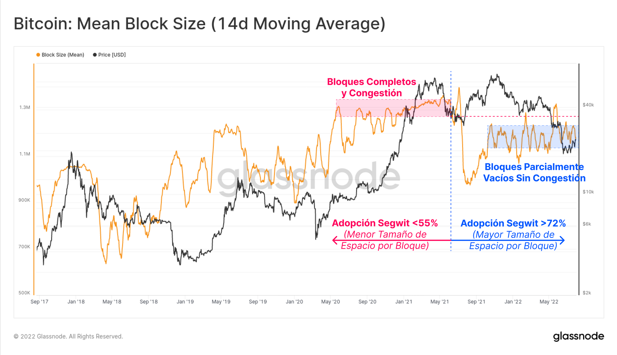 Hay que saber que SegWit es una mejora tecnológica que facilita que se incremente la capacidad máxima de cada bloque de Bitcoin. Antes de junio del 2021, la adopción del SegWit era inferior al 55%, lo que quiere decir que la máxima capacidad por bloque era menor que la actual. A pesar de todo, y aunque la adopción del SegWit haya sobrepasado ya el 72%, con lo que hay más capacidad efectiva por bloque, la congestión actual es todavía más baja que durante mayo del 2021.