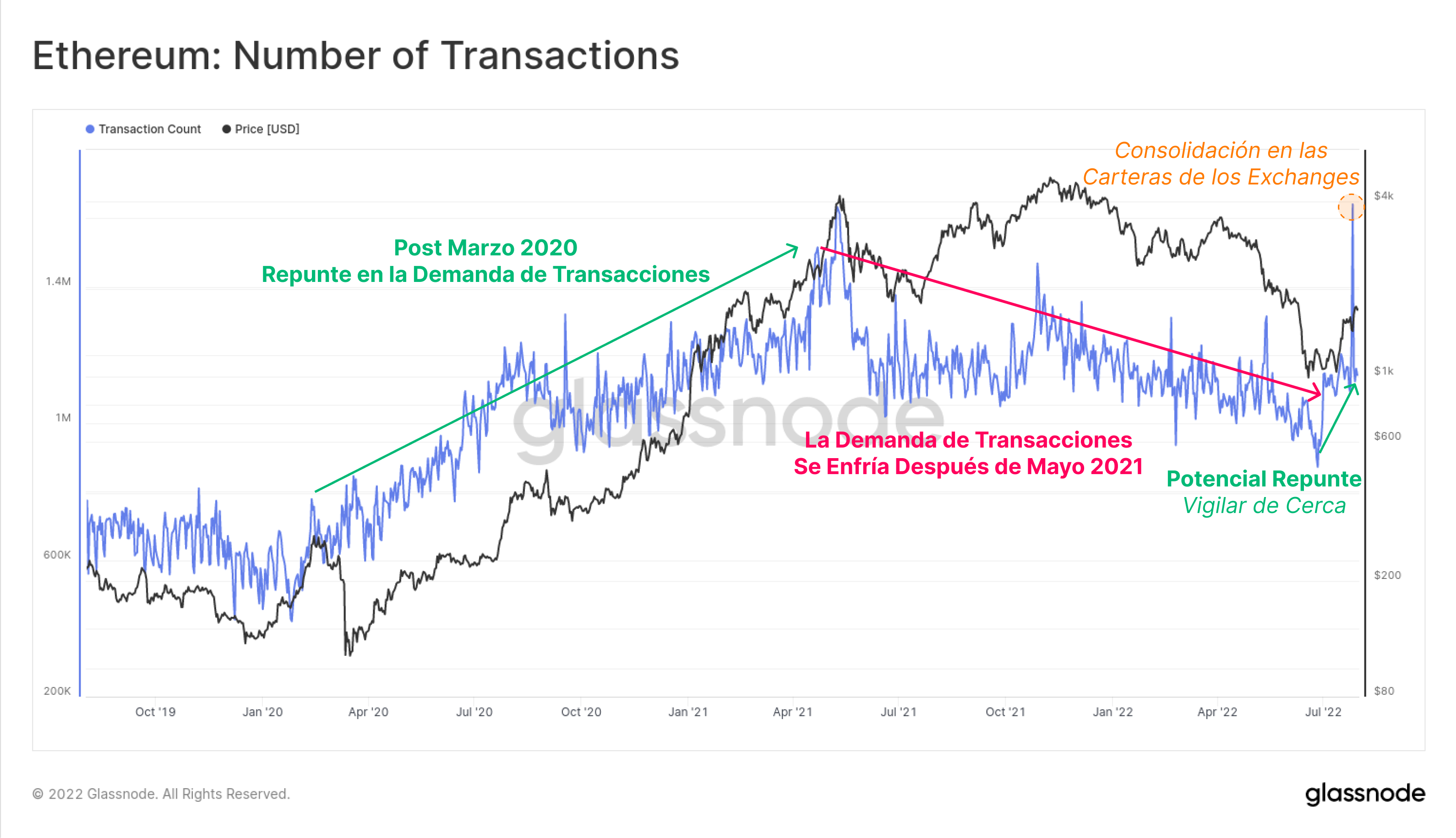 La demanda por transacciones de Ethereum acarrea un declive paulatino desde el desplome de mayo del 2021, sólo interrumpido por un corto repunte de actividad en semanas recientes. Si esta tendencia sigue su curso ascendente, puede ser algo muy positivo, y merece la pena estar pendiente de ella.