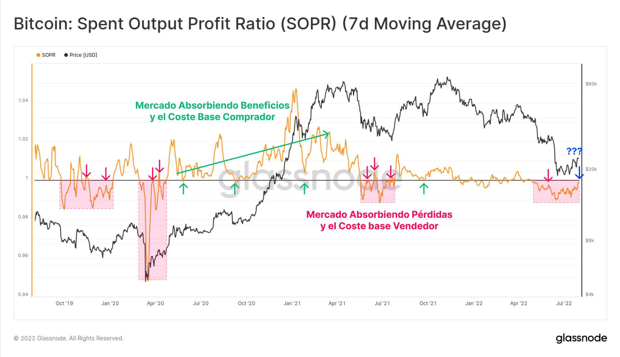 - 🔴 Los valores bajos (< 1,0) indican que de media los inversores están realizando una mayor proporción de pérdidas al gastar sus monedas por debajo de su coste base.