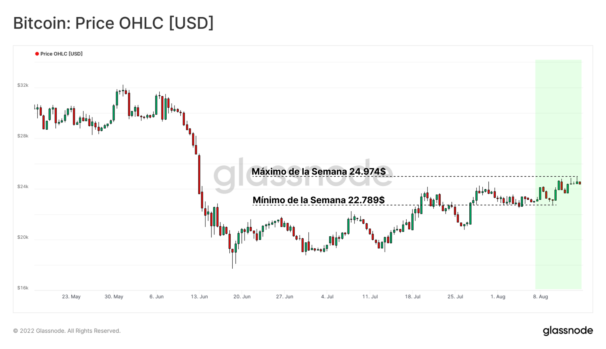 El Mercado de Bitcoin sigue avanzando con el reciente impulso alcista, alineándose con otros activos digitales considerados de alto riesgo que hacen lo mismo, algo muy influenciado por las expectativas de deceleración en las futuras cifras de la inflación. El precio de Bitcoin continúa consolidando dentro de un rango, y esta semana se han abarcado desde unos mínimos de 22.789$ hasta unos máximos de 24.974$.
