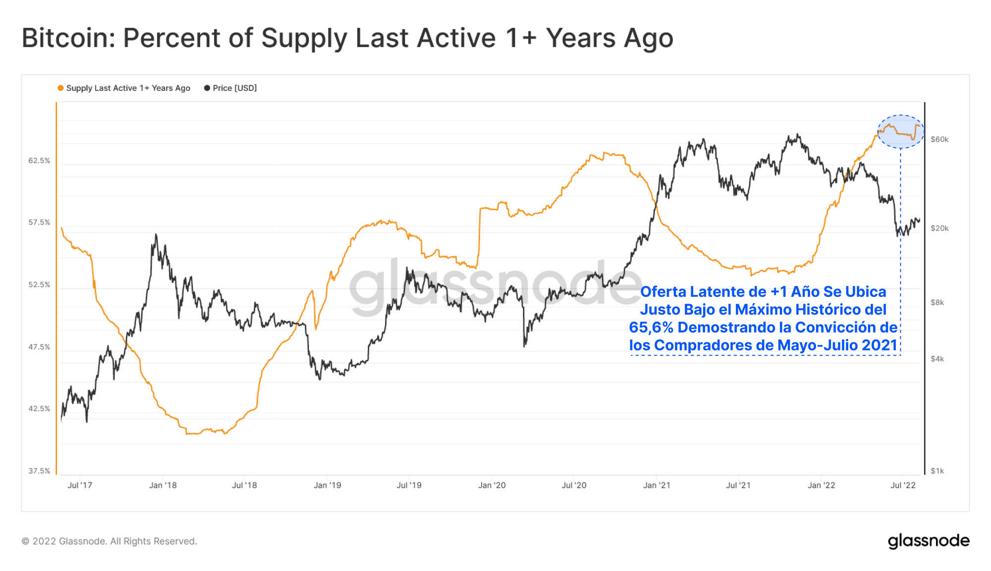 La cantidad de oferta que ha permanecido latente durante al menos 1 año puede usarse para entender al detalle la naturaleza cíclica de Bitcoin desde el punto de vista de sus fases de acumulación y distribución.