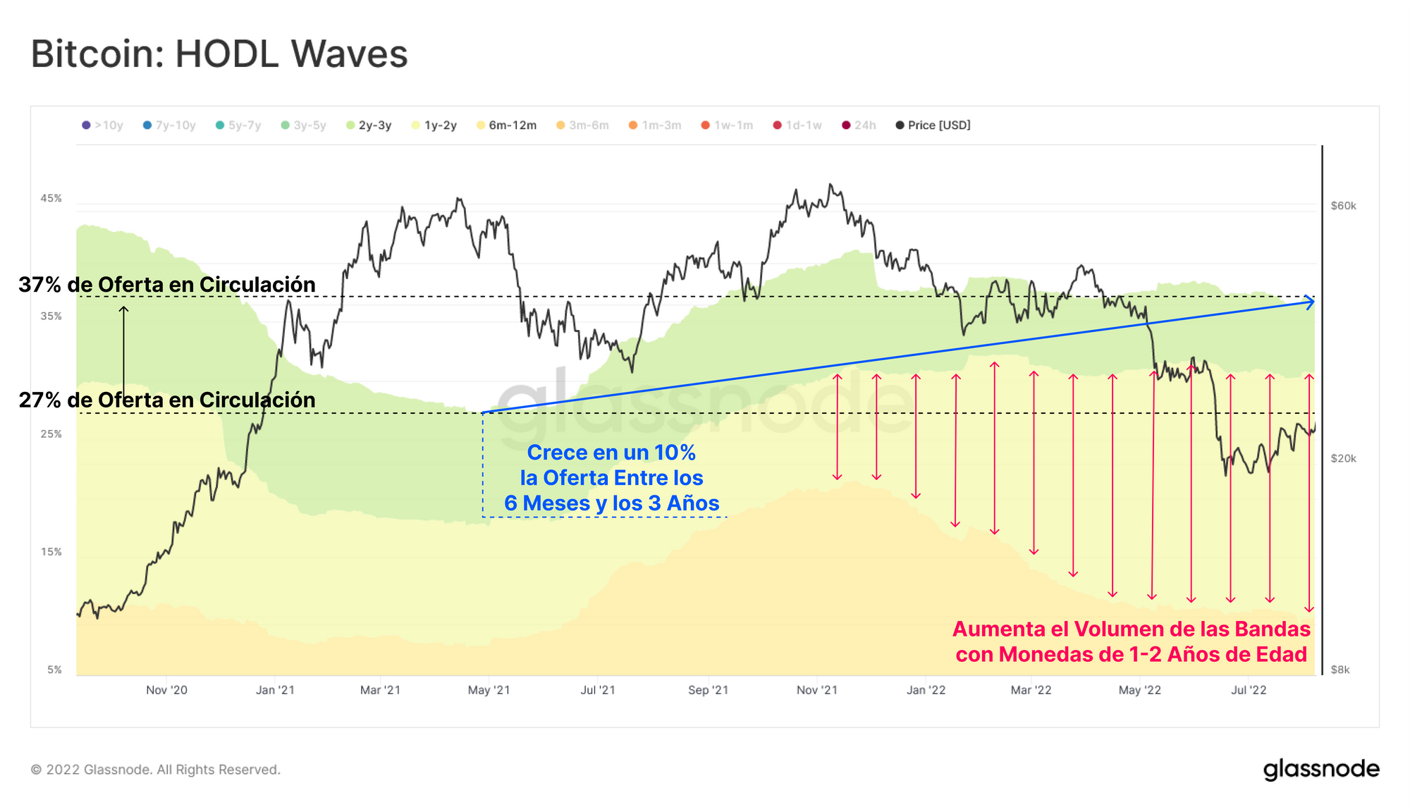 Se aprecia cómo la banda de 6 a 12 meses sufre una clara expansión tras la Gran Migración Minera, consecuencia de que los inversores se negaron a vender en mínimos, y esta hinchazón de oferta coincide además con el suelo que imprime la oferta activa por última vez hace más de un año. Estando sumergida en un régimen ampliamente predominado por HODLers, la oferta ha podido madurar sin problemas provocando un crecimiento de las bandas de 1 y 2 años de edad después del máximo histórico que se alcanzó en noviembre del 2021.