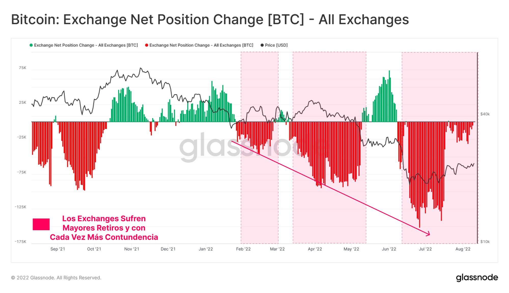 En conjunto, los Exchanges han registrado unos retiros netos de -100.000 BTC después de la capitulación de LUNA de mayo del 2022, y esto representa el 3,2% de los retiros totales desde el anterior máximo histórico alcanzado en marzo del 2022.