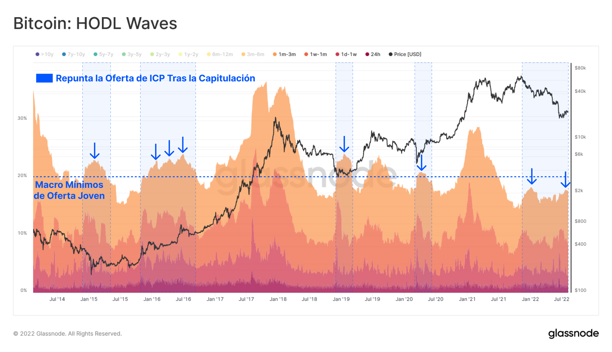 Al mismo tiempo, estos grandes picos de oferta tienden a producirse en los macro mínimos de la oferta joven. Es algo que demuestra cómo sucede tanto la purga final de los últimos vendedores que quedan en el mercado, seguida de meses de acumulación gradual, como del retiro de monedas del mercado activo.