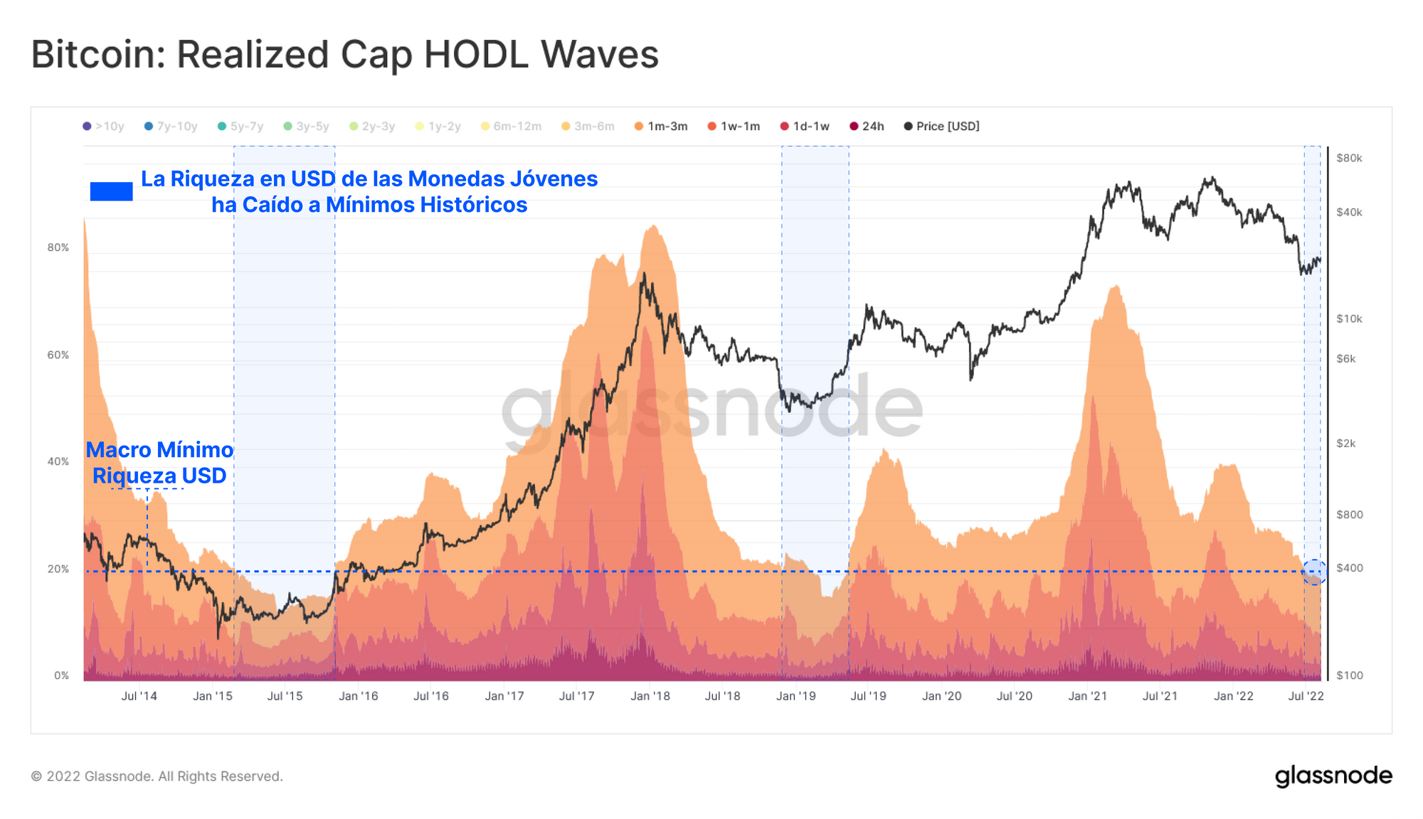 La riqueza denominada en términos de dólares americanos del grupo de Jóvenes Monedas ha mantenido un declive estructural desde que se formase el pico en marzo del 2021. Es principalmente la consecuencia de un comportamiento de acumulación por un lado (permitiendo que las monedas maduren), pero también de la revalorización de monedas a precios cada vez más bajos durante el periodo bajista.