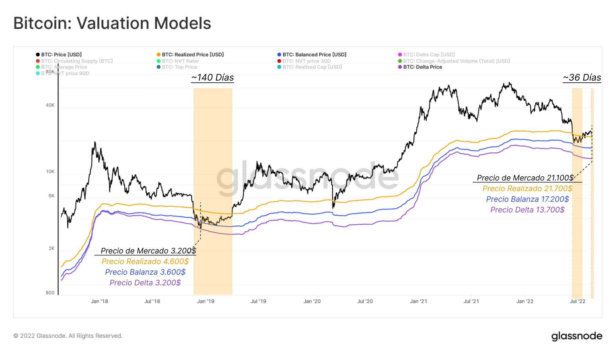 Dado que el Precio Realizado se encuentra otra vez sobre nuestras cabezas, dos modelos de valorización del blockchain vuelven a encontrarse bajo niveles de posible soporte. El Precio Delta y el Precio Balanza son unos modelos de precio muy bien conocidos dentro del ámbito del análisis del blockchain, que cuentan con una larga trayectoria que converge con los precios durante los suelos de ciclo.
