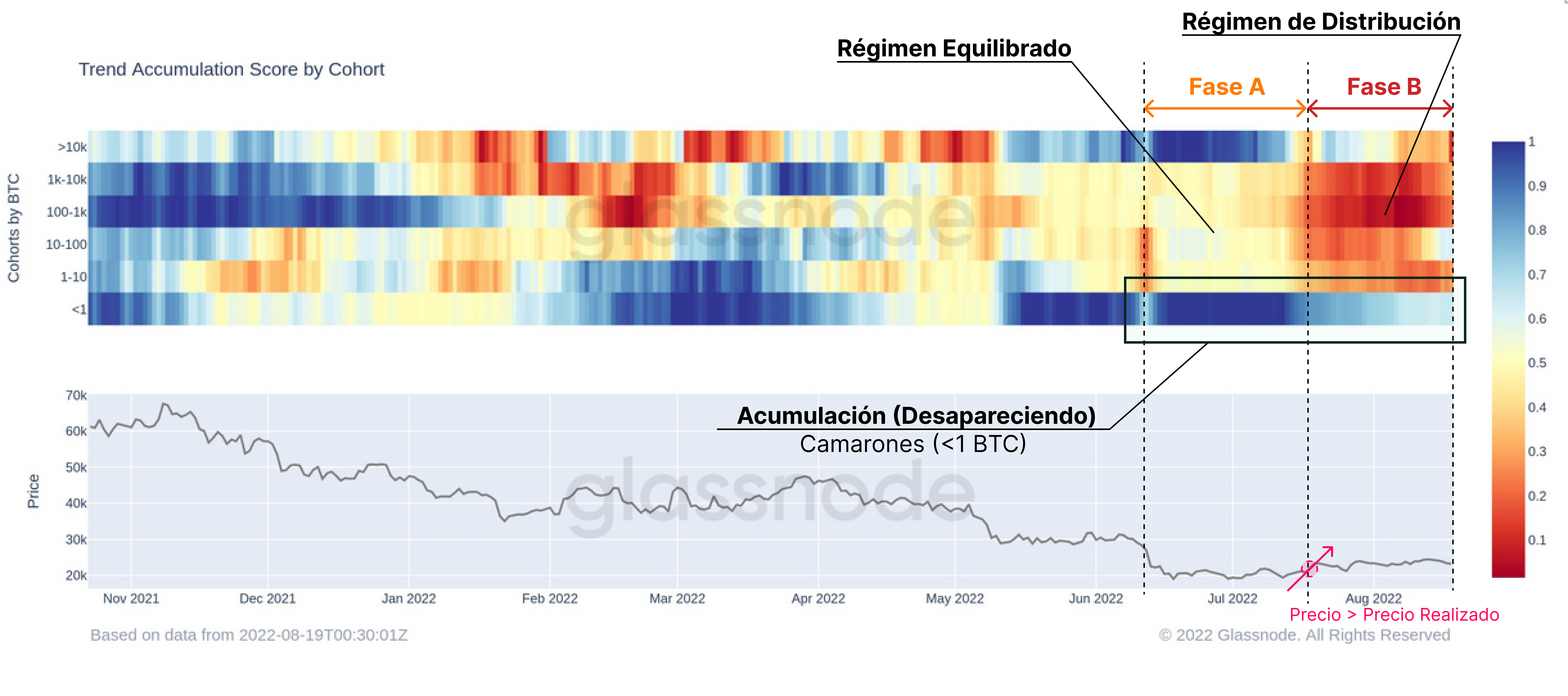 - Fase A 🟡: Tras caer bajo los 20.000$, los Camarones (<1 BTC) y las Ballenas (>10.000 BTC, ignorando a exchanges y mineros) acarrearon una acumulación neta, mientras que el resto de clases inversoras mantuvieron un Régimen Equilibrado.