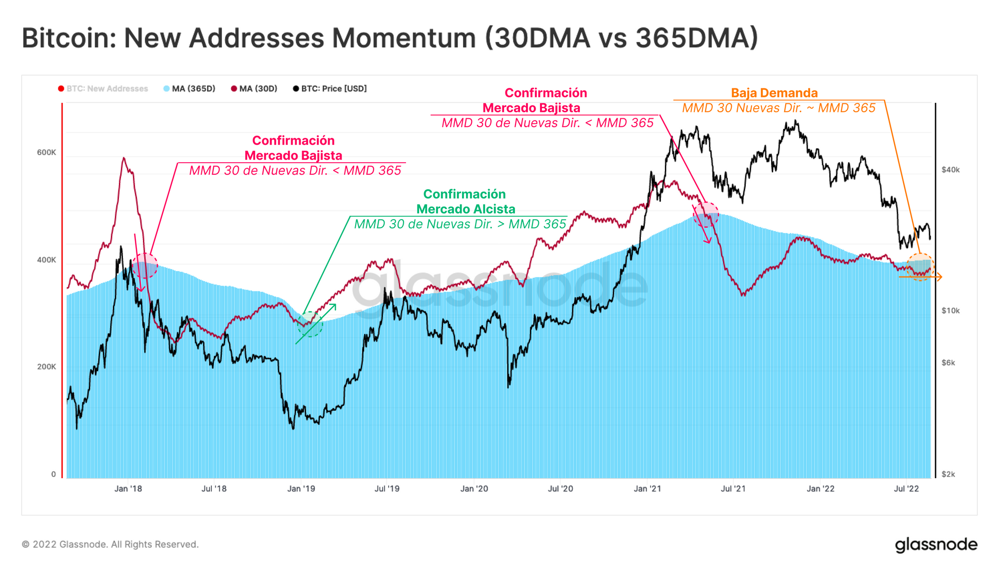 Observando el reciente rebote del precio sobre el precio realizado encontramos que la media mensual de las Nuevas Direcciones sigue estando por debajo de la media anual 🟡. Se trata de un patrón que puede considerarse como una confirmación de baja demanda en un mercado bajista.