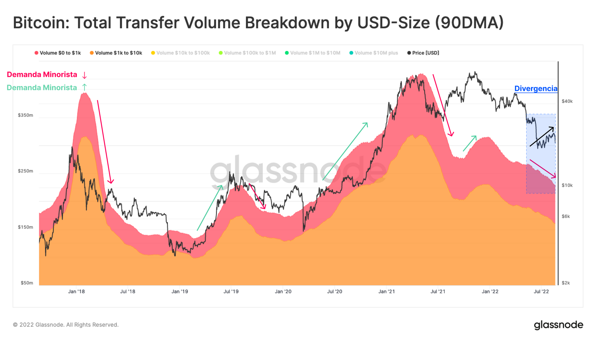 La presencia de inversores minoristas en la red puede identificarse analizando la tendencia a largo plazo de las transacciones de menor tamaño. La siguiente gráfica presenta la media móvil de 90 días del volumen total que corresponde a transacciones que se ejecutan con valor de menos de 10.000$.