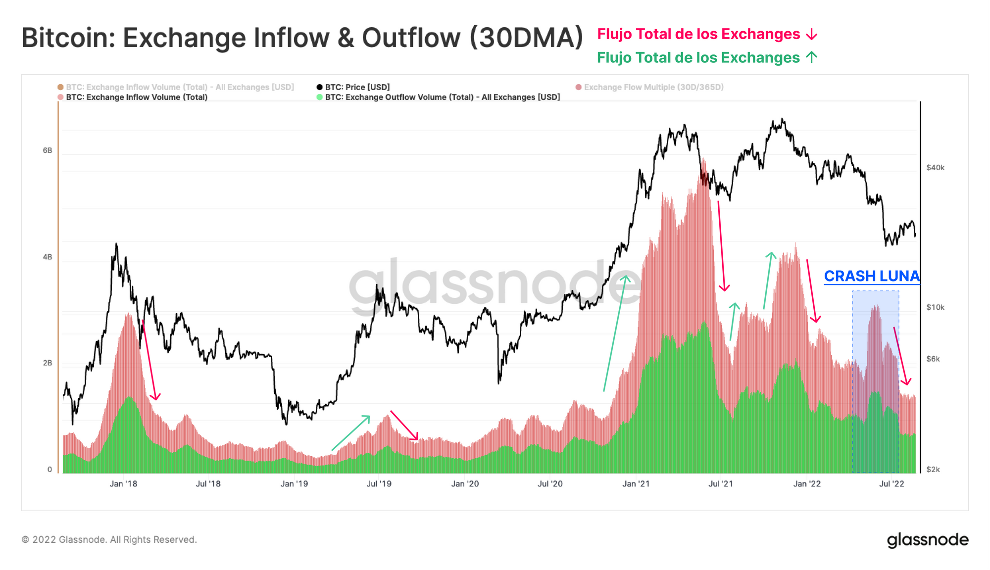Los flujos de los exchanges se componen de la media en dólares americanos de los volúmenes de ingresos y retiros que tienen en cuenta a todos los exchanges (p.ej. ingresos + retiros dividido por 2).