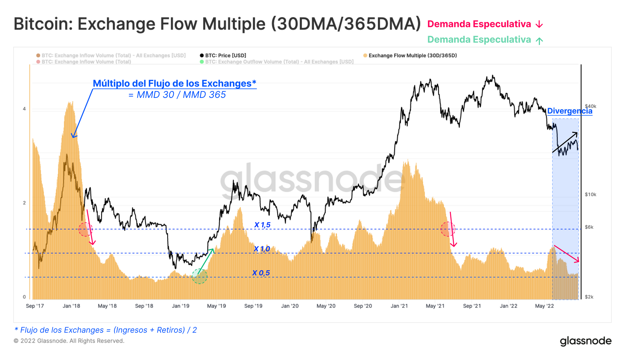 El Múltiplo del Flujo de los Exchanges puede utilizarse como un nivel que delimita las etapas más tempranas 🔴 y los estadios finales 🟢 de un mercado bajista. Alineándose con las gráficas que veíamos antes, el reciente retorno del precio que nos ha levantado desde los mínimos de junio del 2022 🟦 no venía acompañado de un flujo entrante significativo de especuladores al mercado.